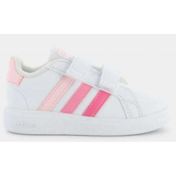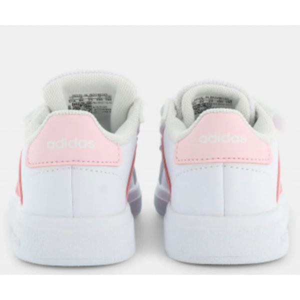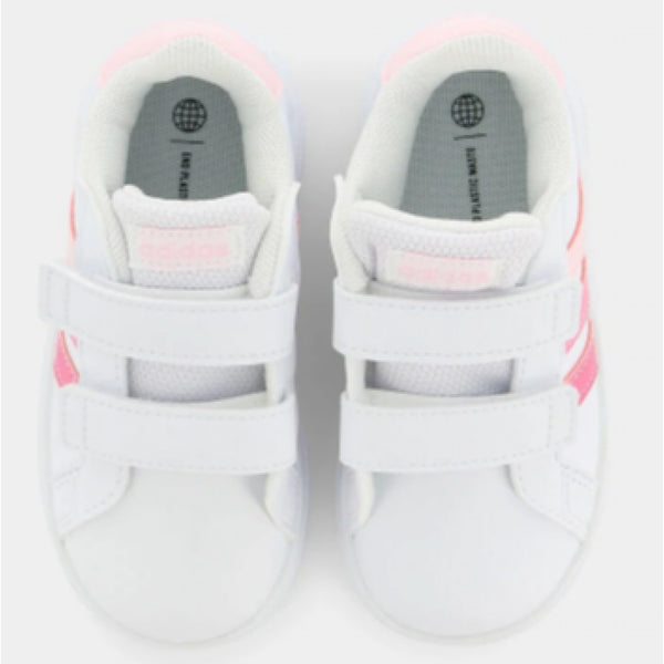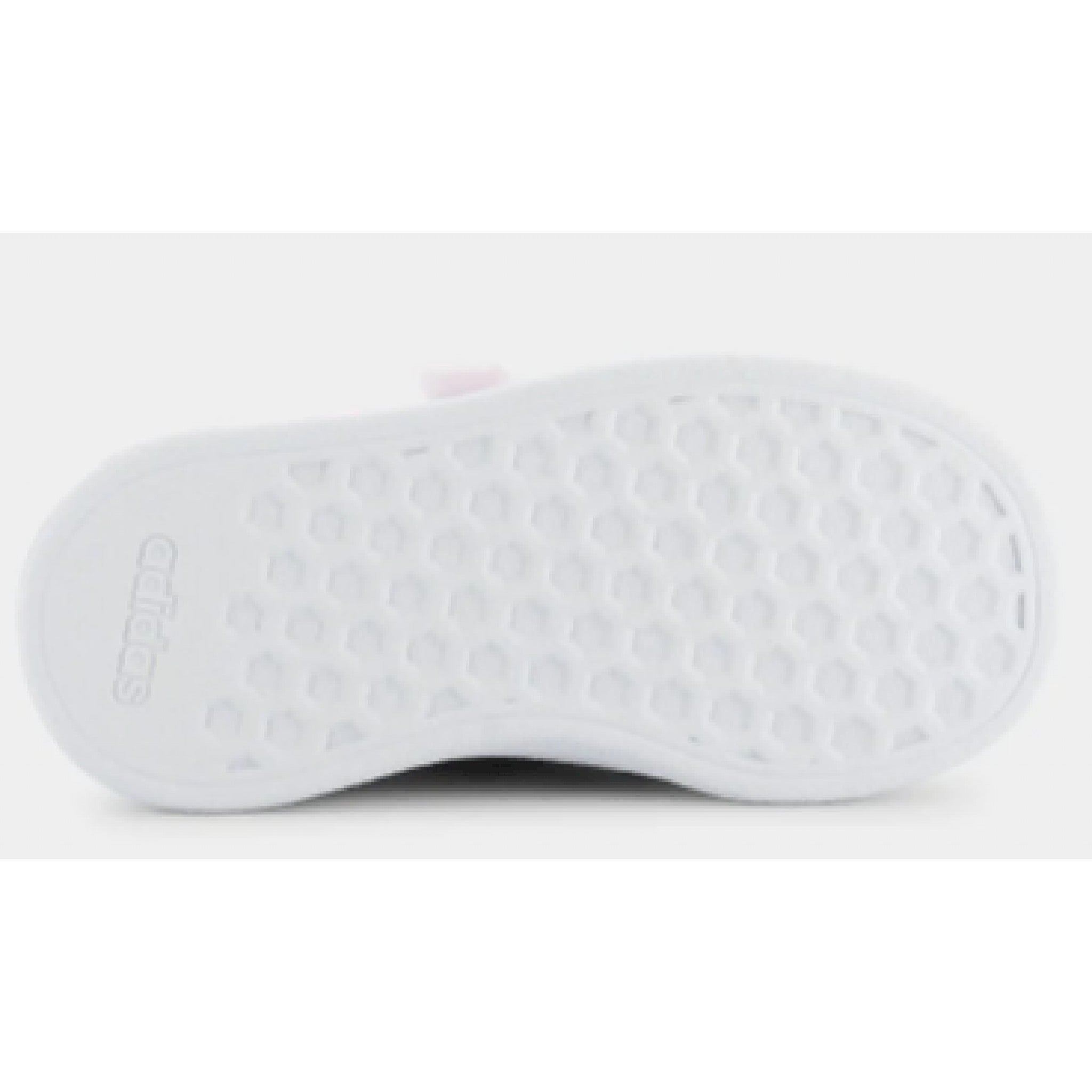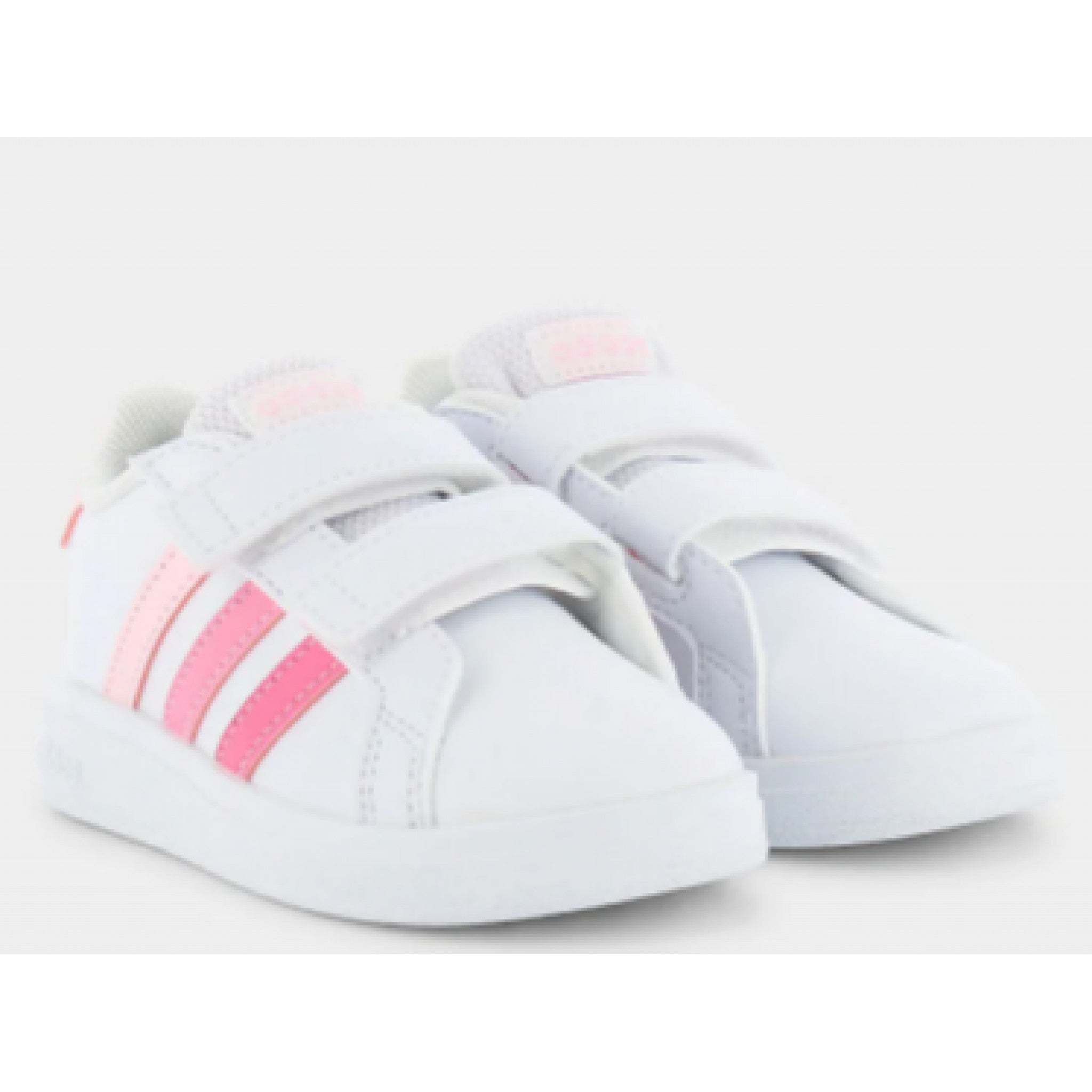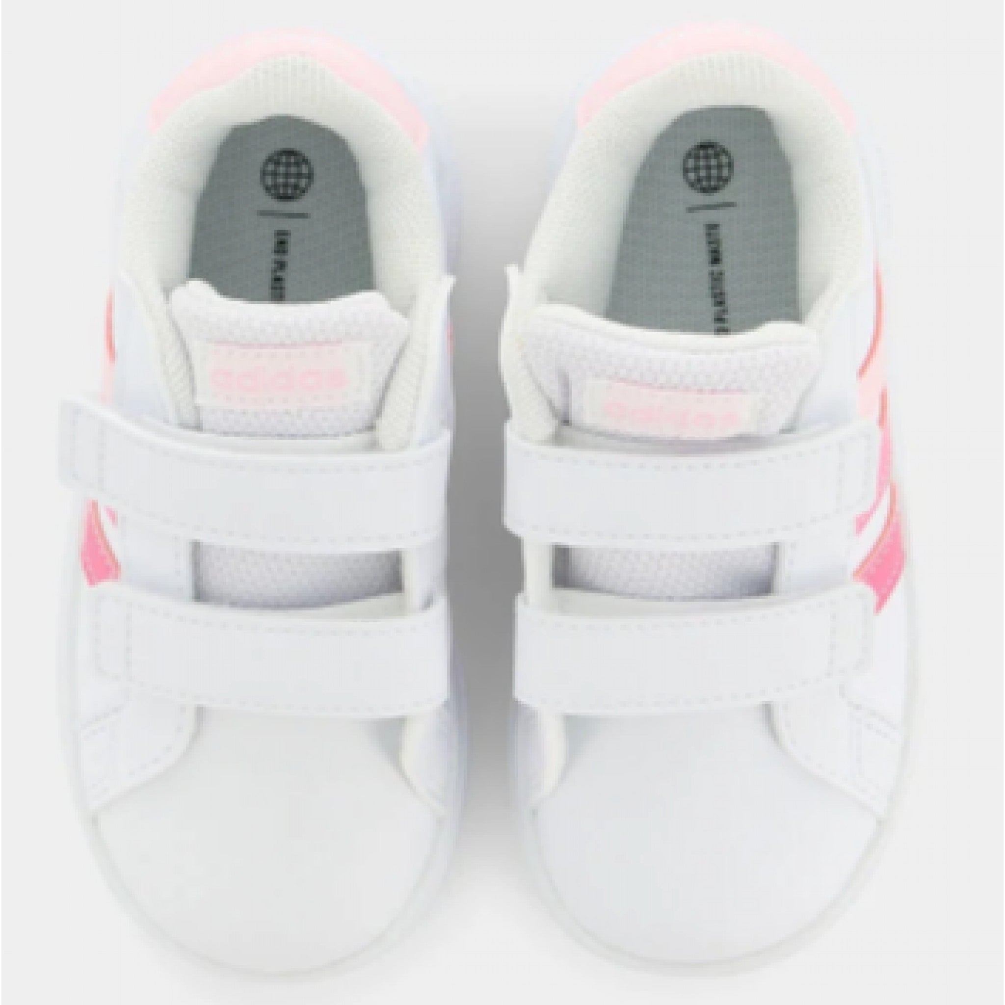 Queste scarpe sportive da bambina primi passi adidas sono graziose e divertenti. la particolarità di queste scarpe sta anche nella scelta dei materiali: la tomaia è stata in parte realizzata in pu riciclato. in questo modello adidas grand court 2.0 dalle linee semplici e raffinate, l'allacciatura è rapida e facilmente regolabile grazie alla chiusura a strappo. fodera e soletta in tessuto sono morbide e perfette per accompagnare e sostenere i piedi delicati dei bambini. la tomaia bianca effetto opaco è decorata con le classiche tre strisce del marchio ai lati. per questo modello sono state scelte tre sfumature di rosa. la suola antiscivolo garantisce aderenza e stabilità, rendendo queste scarpe l'ideale per qualsiasi attività del tempo libero.