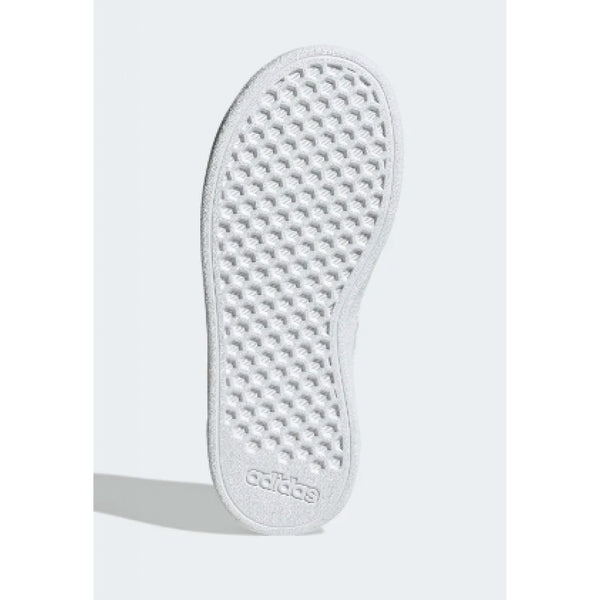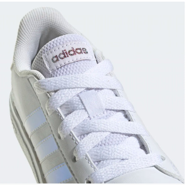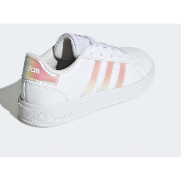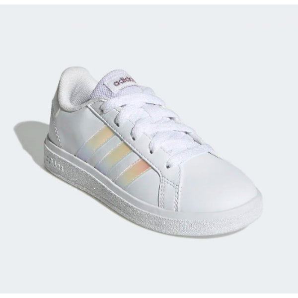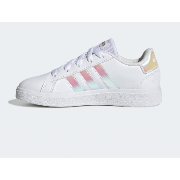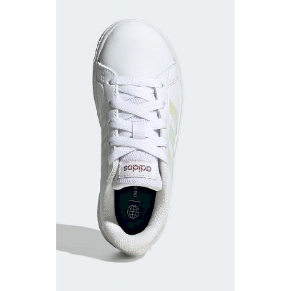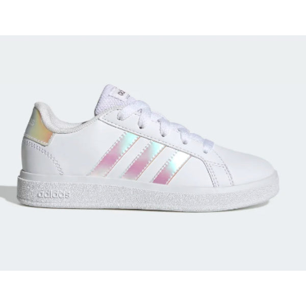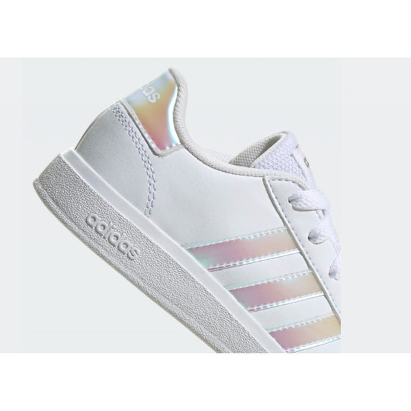 adidas ha rielaborato le iconiche sneaker grand court per adattarle ai piedi di bambini e bambine. la tomaia sintetica, morbida e resistente, è abbinata a una suola preformata in gomma flessibile che supporta e protegge i loro piedi e tranquillizza i genitori.