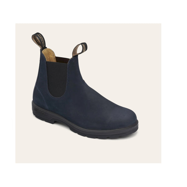 Stivaletti modello blundstone #1940 della serie classics in stile chelsea, con elastici laterali e tomaia liscia in pelle nabuk navy con impunture tono su tono. linguetta frontale e posteriore per aiutarvi nella calzata, suola in gomma dentata con tallone rialzato e logato dall’ottimo grip. una scarpa in stile classico e dal look senza tempo facilmente abbinabile.