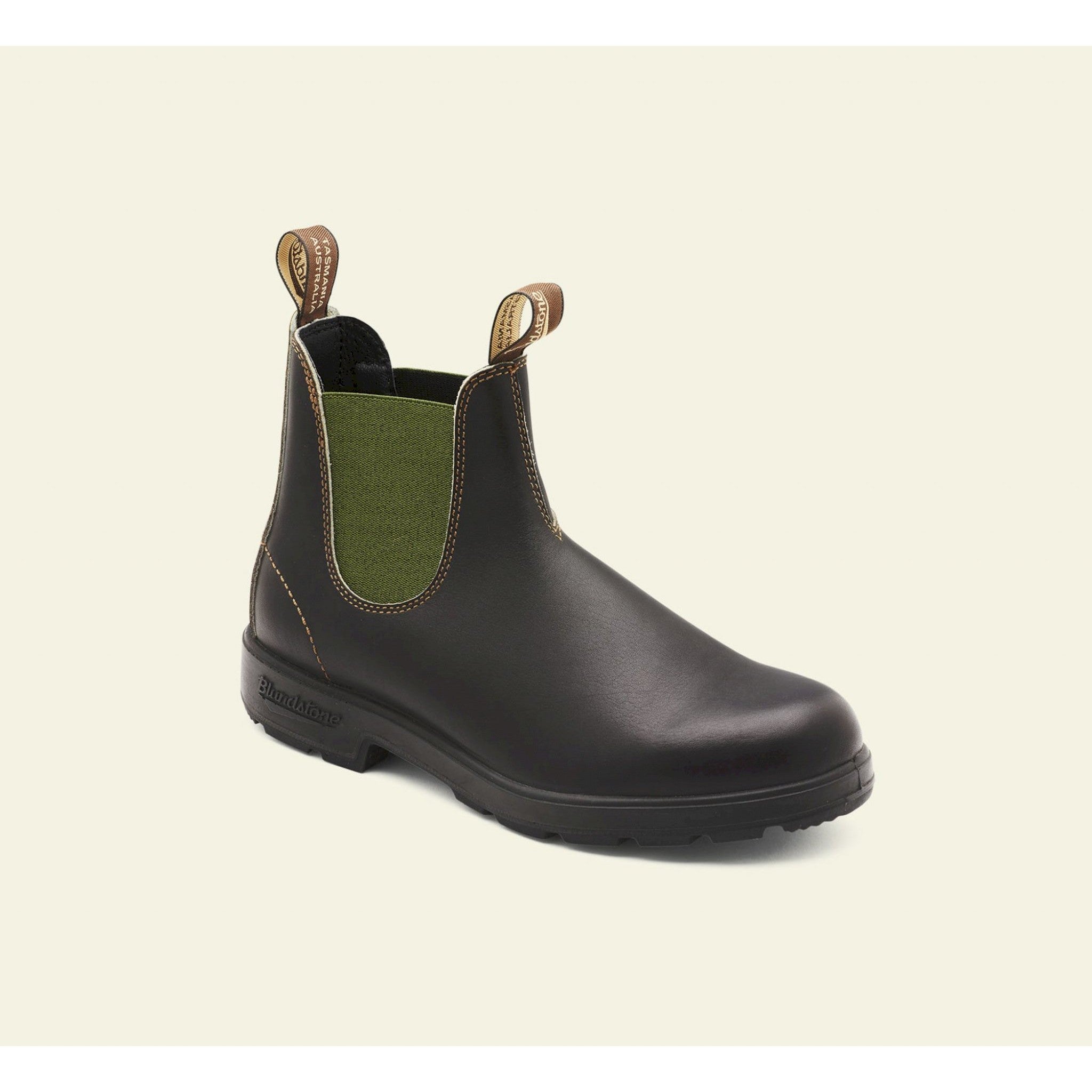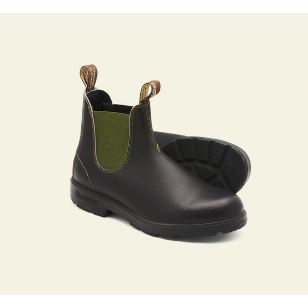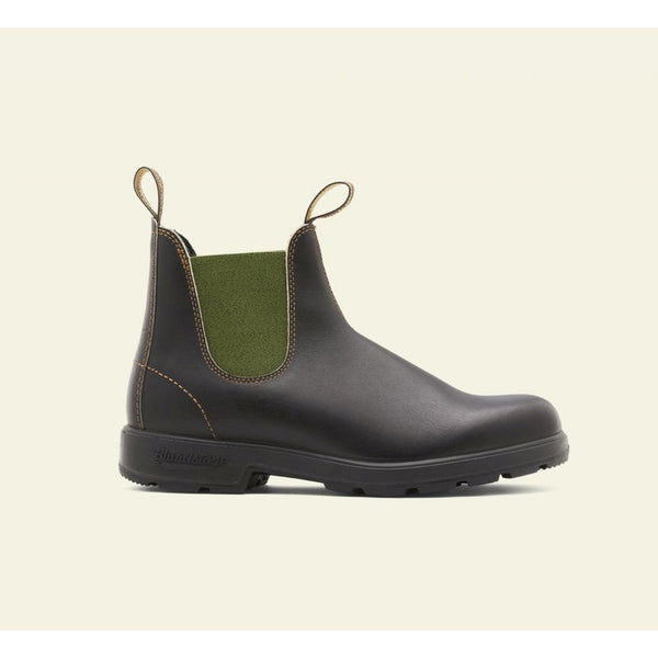 Look fashion per lo stivaletto silhouette chelsea modello blundstone #519, realizzato in pelle marrone impermeabile con elastici laterali verde salvia. presentano tomaia liscia con impunture frontali e sul tallone per un tocco ricercato. linguetta anteriore e posteriore per una calzata facile e suola in gomma dentata antiscivolo. stivaletti casual chic della serie originals, per look quotidiani che vi faranno notare per classe e stile.
