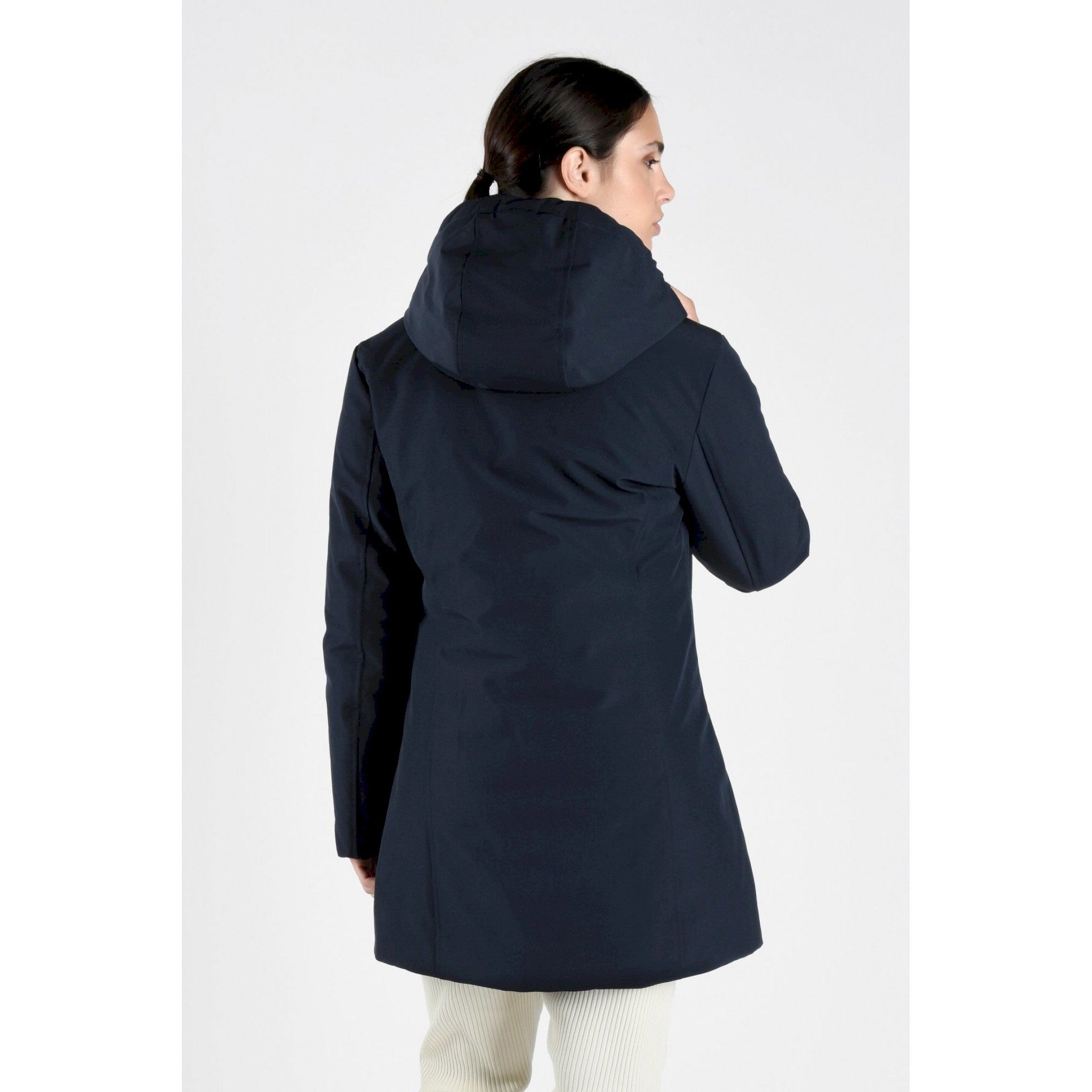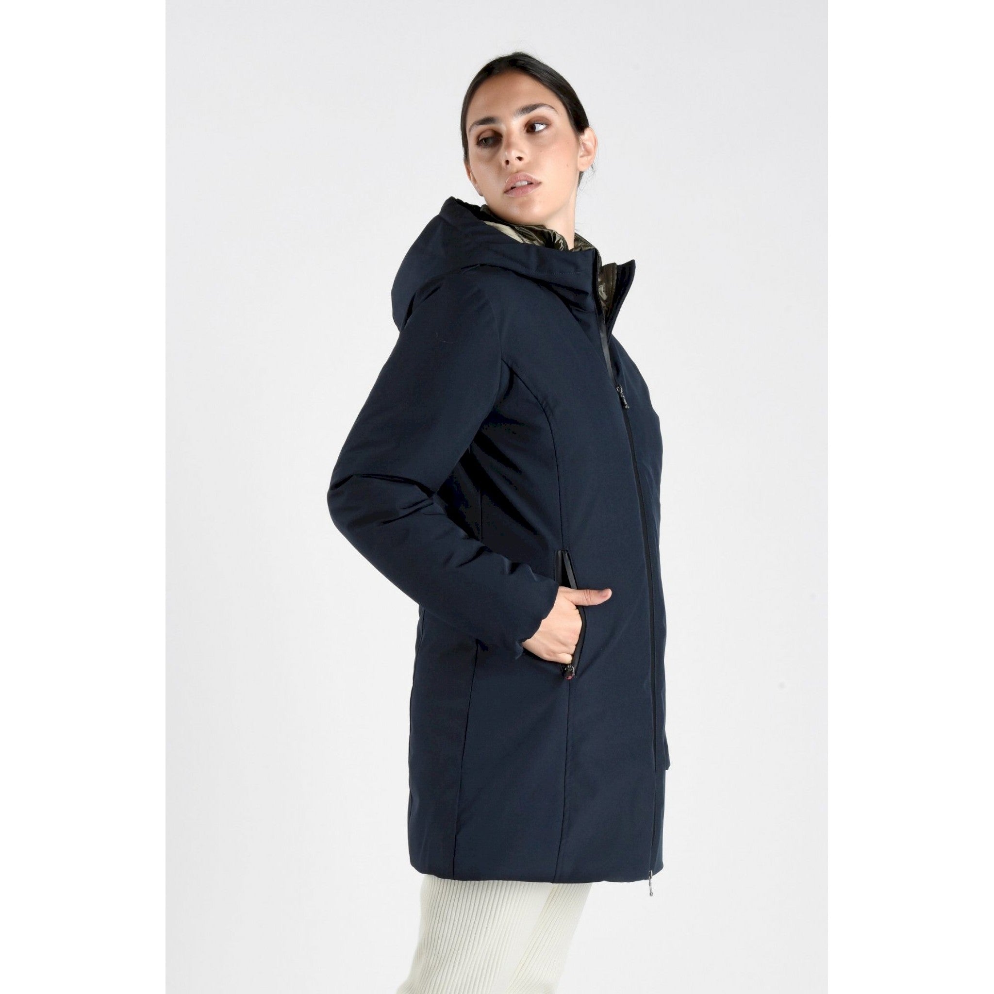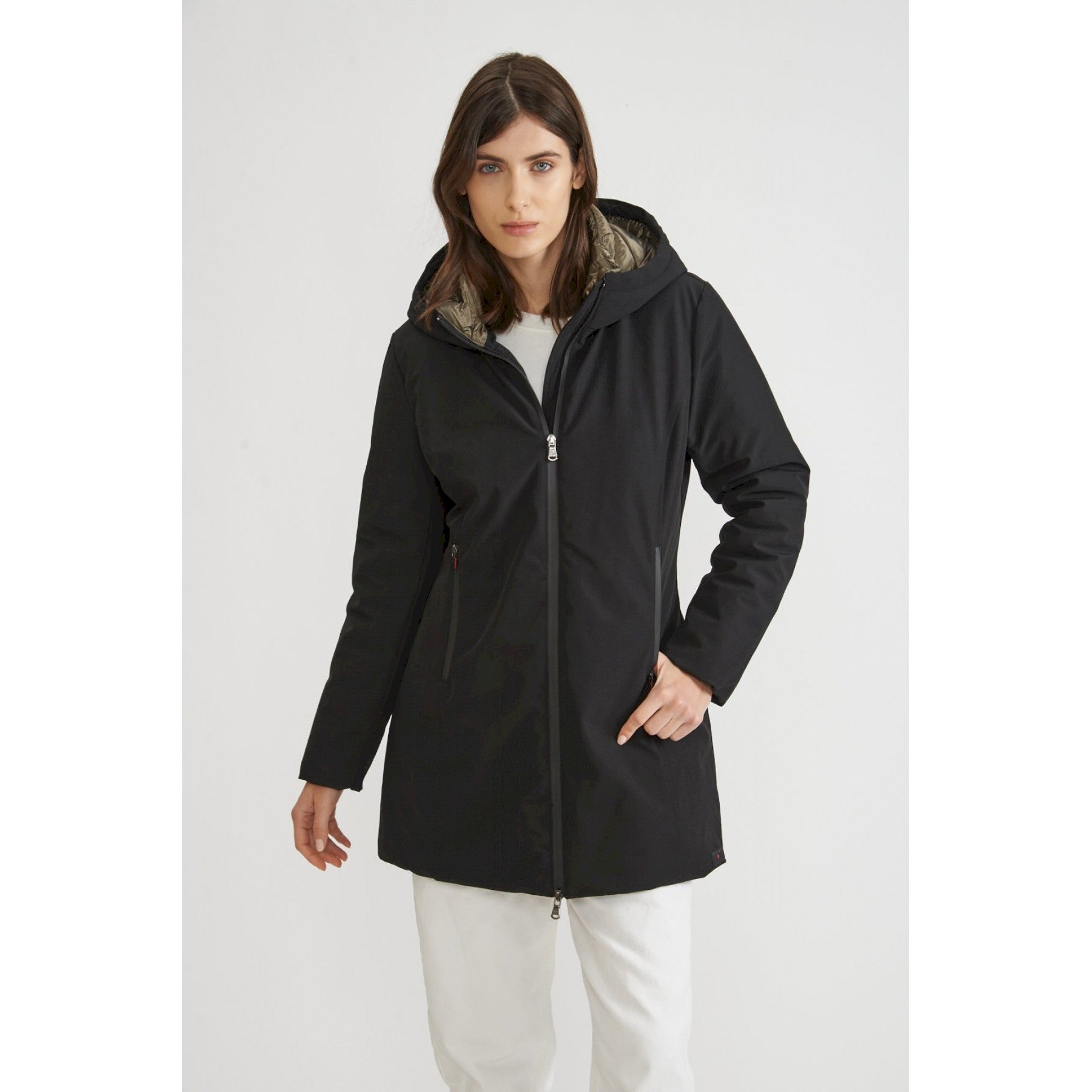 Giacca lunga donna modello yorkton w long in tessuto resistente all'acqua e trattamento bionic finish eco, con cappuccio e imbottitura in piuma ecologica. dettaglio zip centrale e tasche waterproof. perfetto per ripararsi dal freddo e dall'acqua. composizione 100% poliestere, imbottitura 100% poliestere. vestibilità slim
