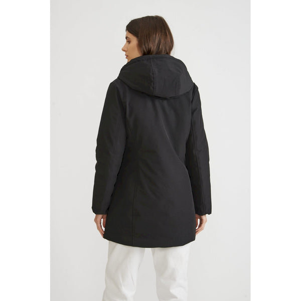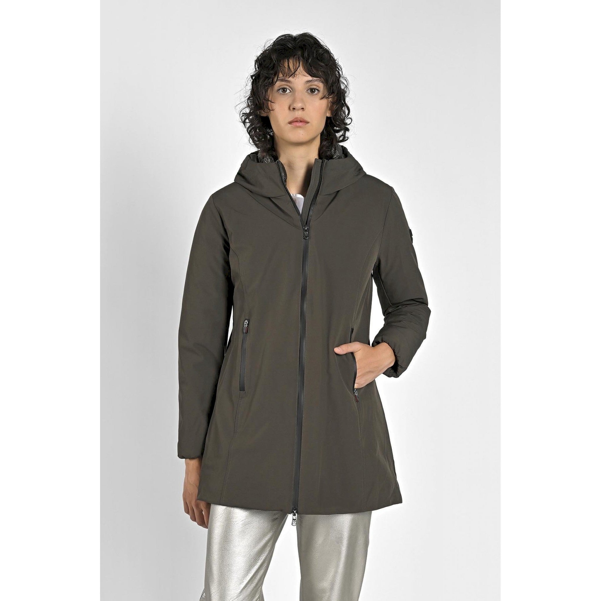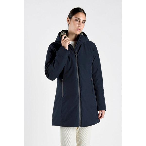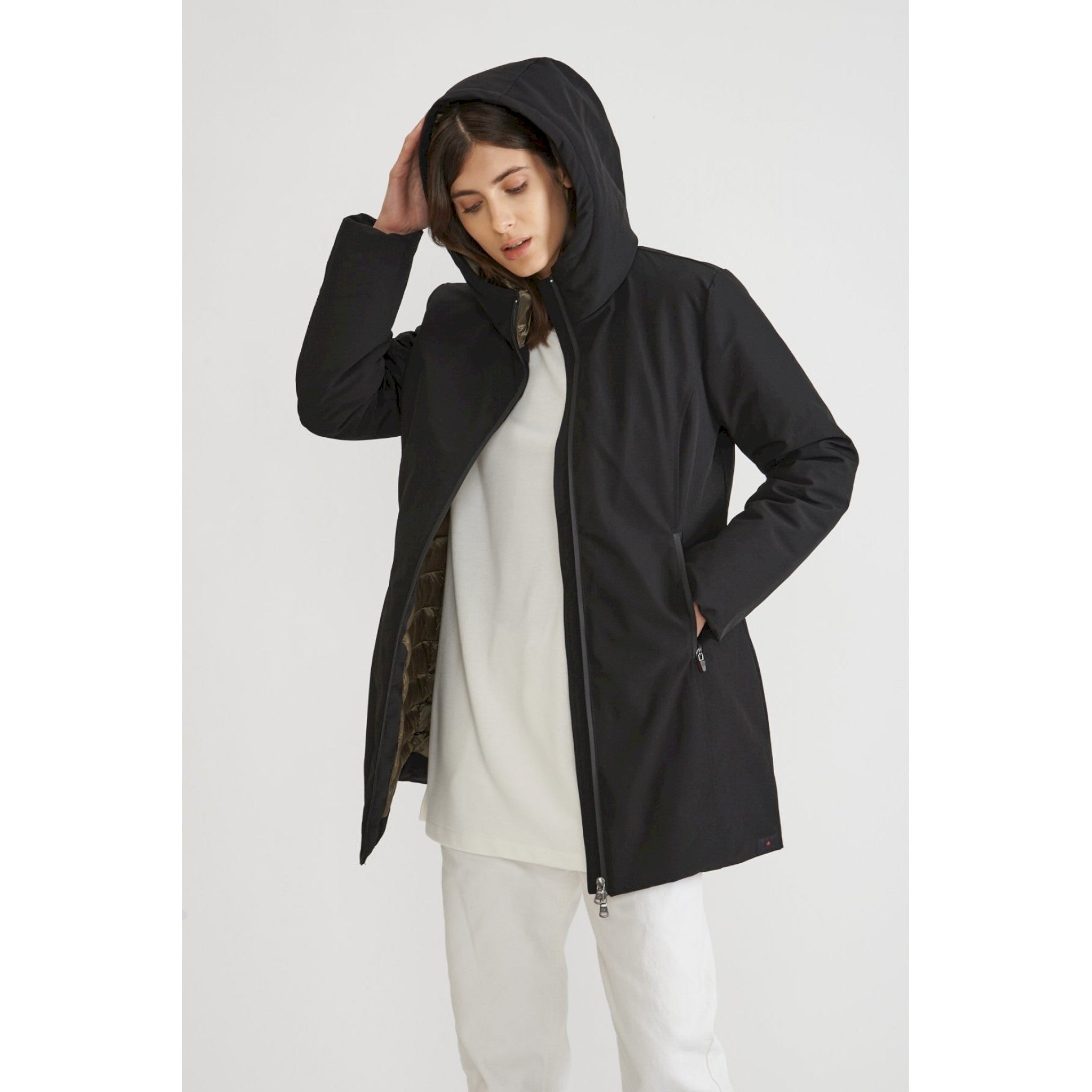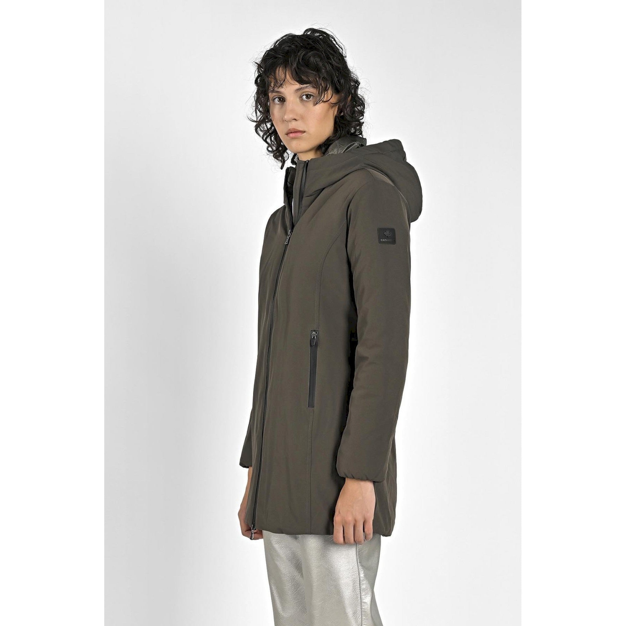 Giacca lunga donna modello yorkton w long in tessuto resistente all'acqua e trattamento bionic finish eco, con cappuccio e imbottitura in piuma ecologica. dettaglio zip centrale e tasche waterproof. perfetto per ripararsi dal freddo e dall'acqua. composizione 100% poliestere, imbottitura 100% poliestere. vestibilità slim