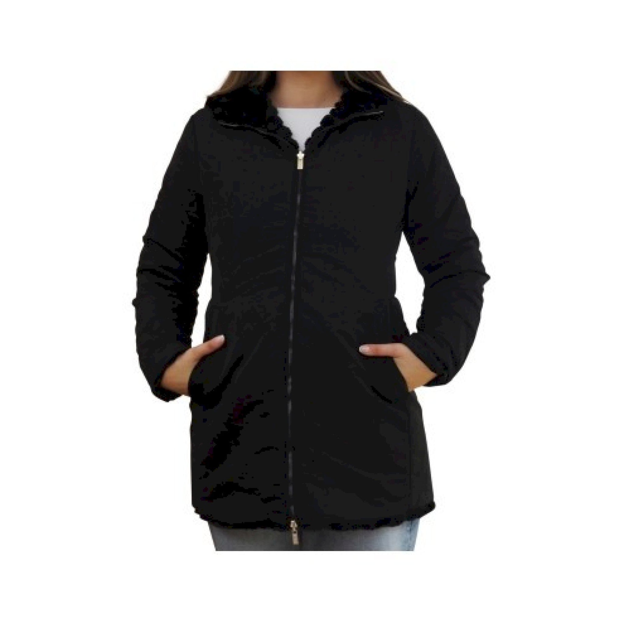 Giacca reversibile ì, lunghezza tre quarti con cappuccio, da una parte lato liscio e da un lato rivestito di pelo ecologico/maniche in tessuto liscio