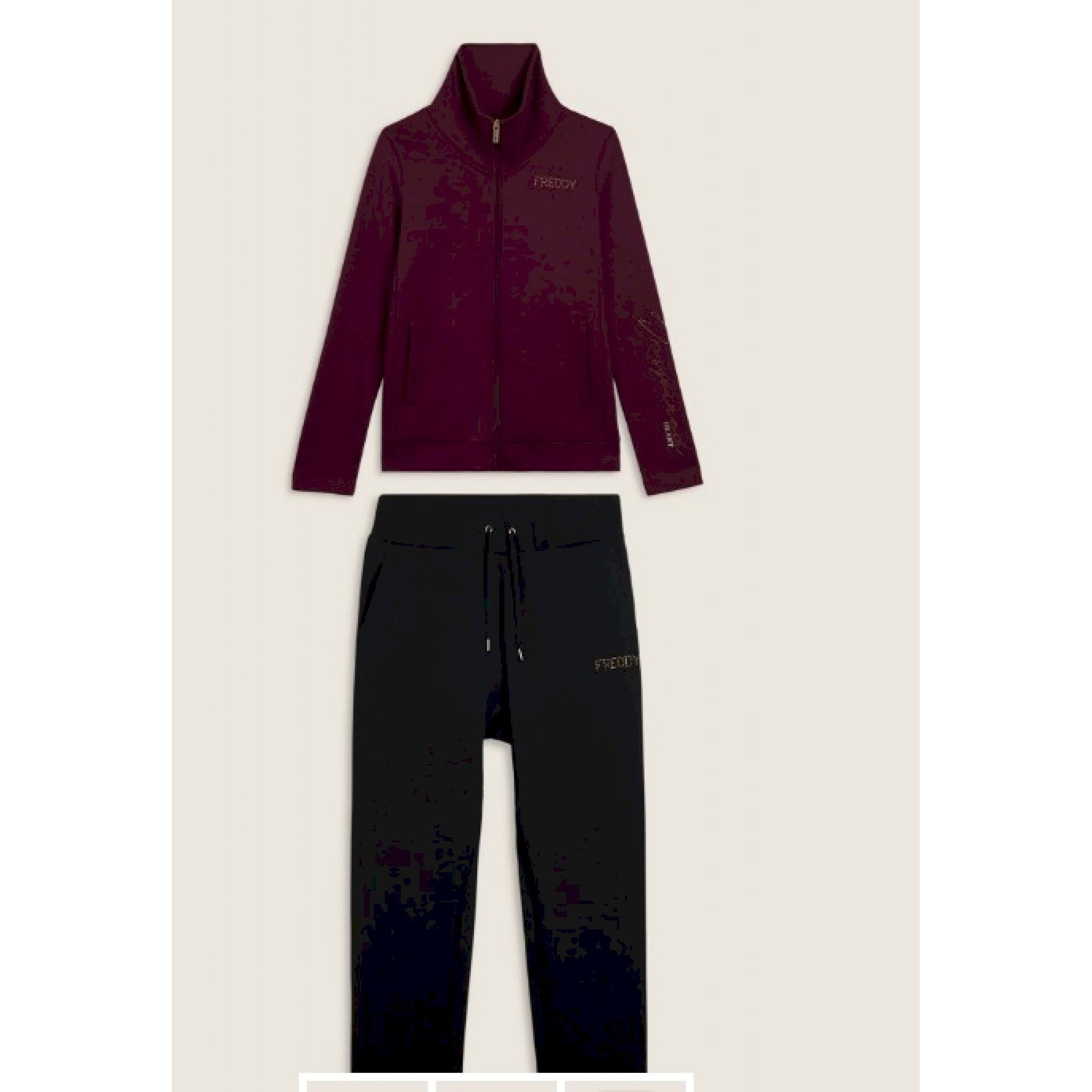 La felpa presenta una chiusura full zip, collo alto, maniche lunghe con polsini e fascia sul fondo. sulla manica sinistra spicca la scritta “inspired heart” composta da strass, che si abbina al logo freddy decorato su cuore e pantalone. i pantaloni, con gamba dritta e coulisse in vita, sono dotati di tasche alla francese. la felpa invece include tasche a filetto, pratiche ma discrete.