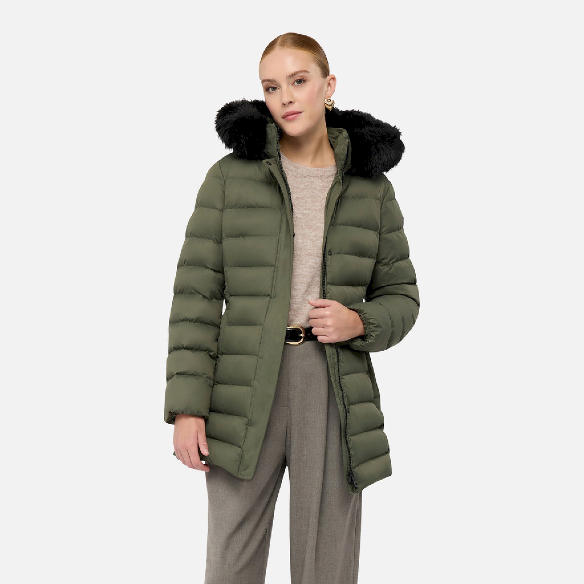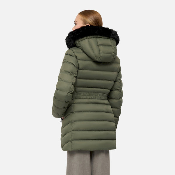 Piumino lungo, dotato di una cintura che esalta armoniosamente il punto vita, è realizzato in poliestere riciclato idrorepellente e antivento, con pelliccia staccabile e morbida imbottitura in piuma rigenerata xdown che garantisce calore e traspirazione.