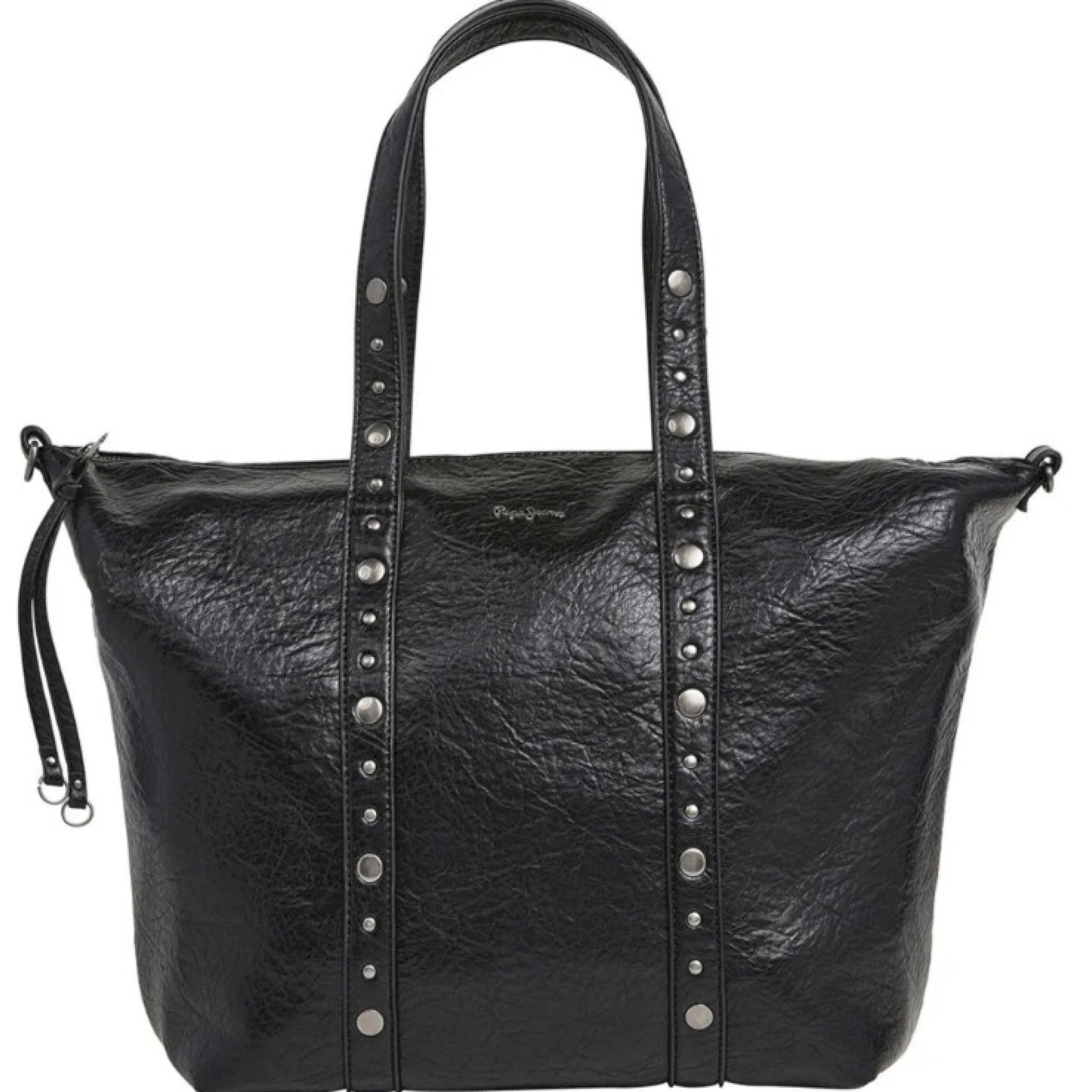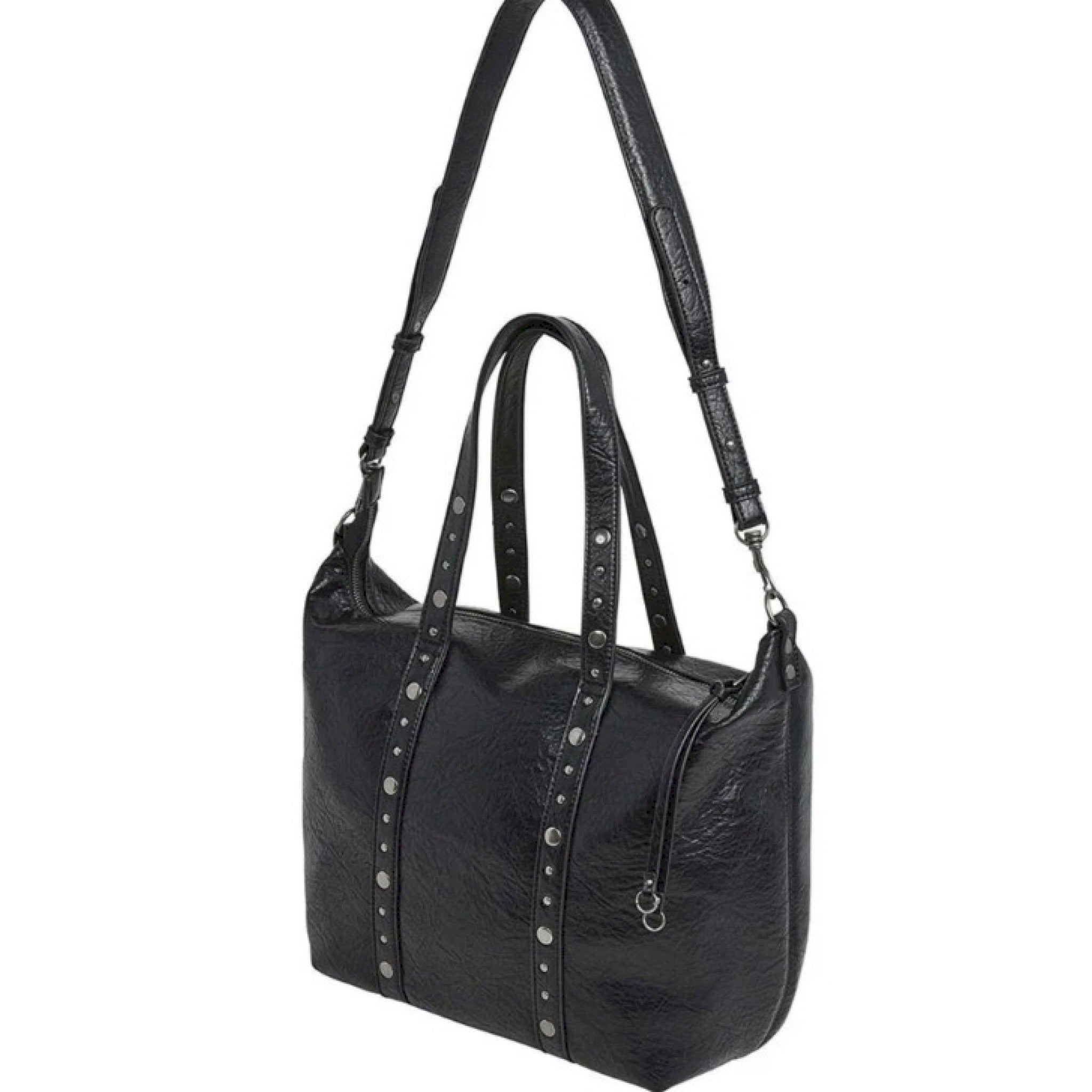 Borsa bowling chelsea moon realizzata in pu con borchie rotonde metalliche, chiusura a zip, scomparto singolo, tasca interna, manico con borchie metalliche, tracolla lunga regolabile e removibile, placca logo in metallo sul davanti.