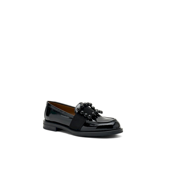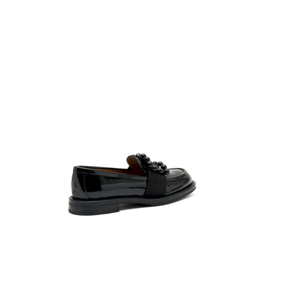 Moderno e ricercato ma decisamente versatile questo mocassino in vernice lucidissima effetto smalto illuminerà con i suoi riflessi ogni passo. ideale per il quotidiano o per le occasioni speciali è arricchito dal prezioso accessorio a semisfere.