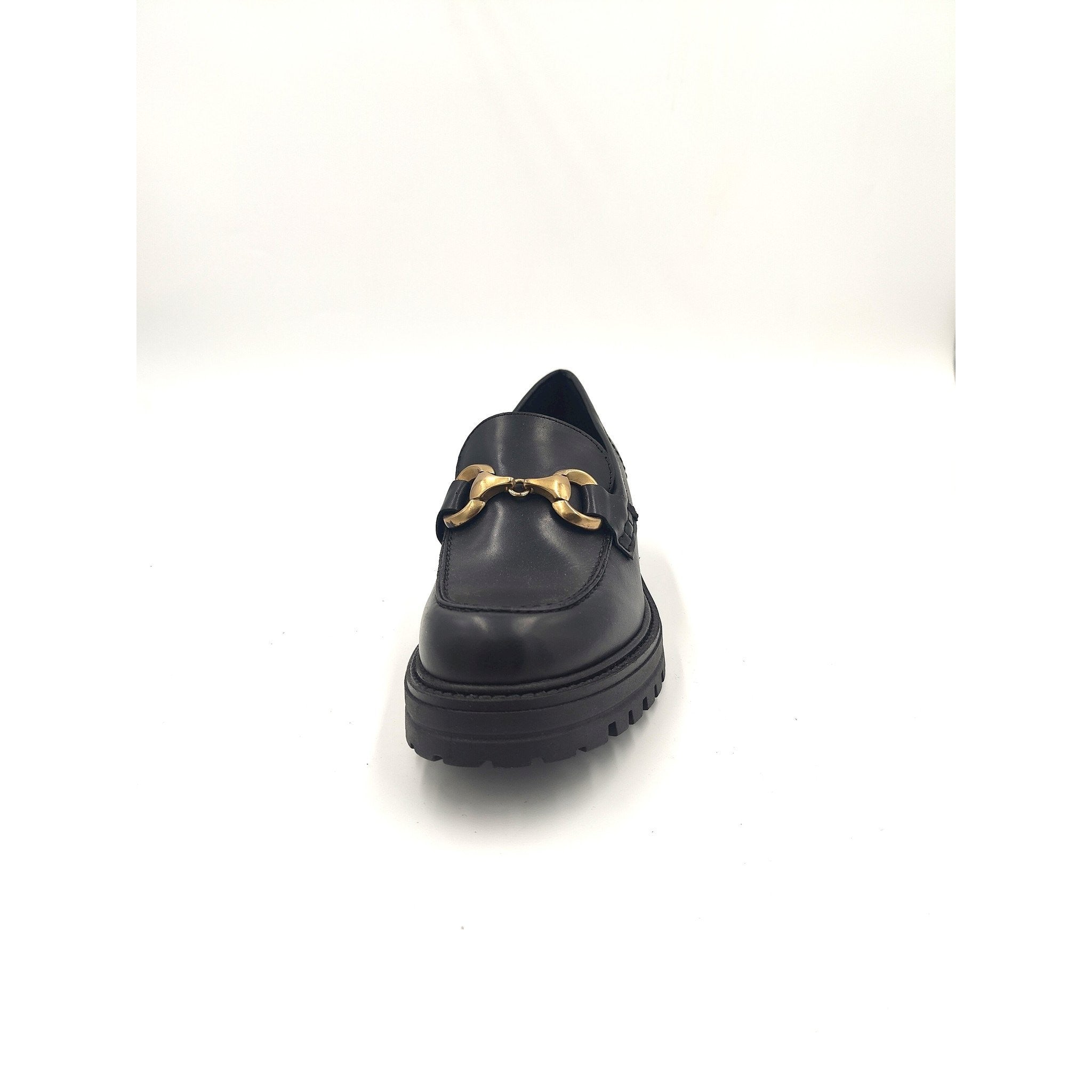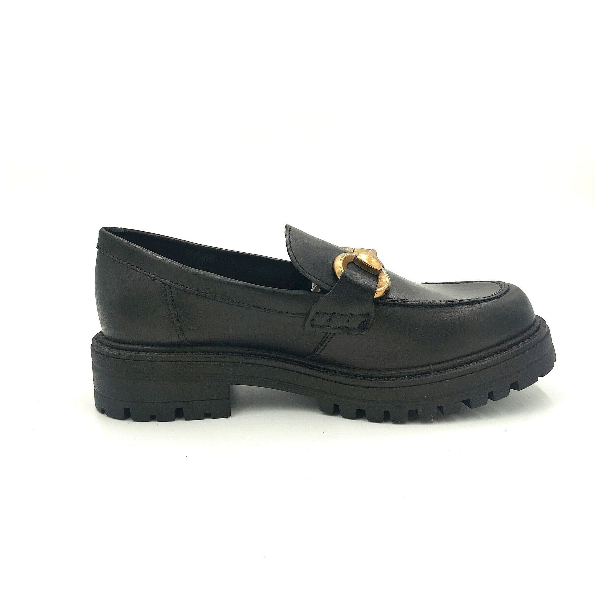 Mocassino in pelle nera con accessorio a catena piatta color oro, risvolto e cuciture