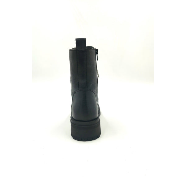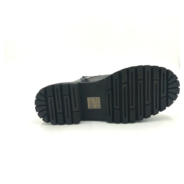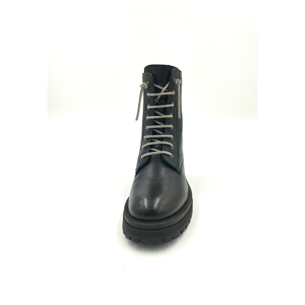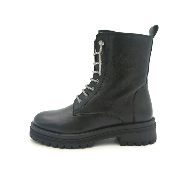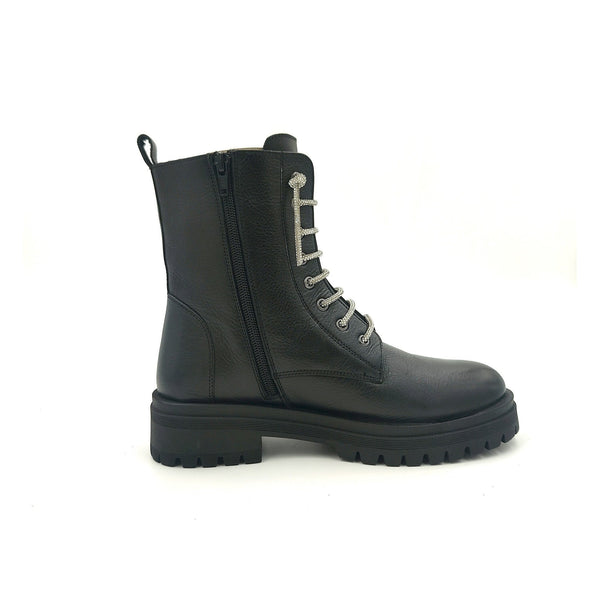 Anfibio in pelle nera con strighe in strass e cerniera f.do carroarmato in gomma