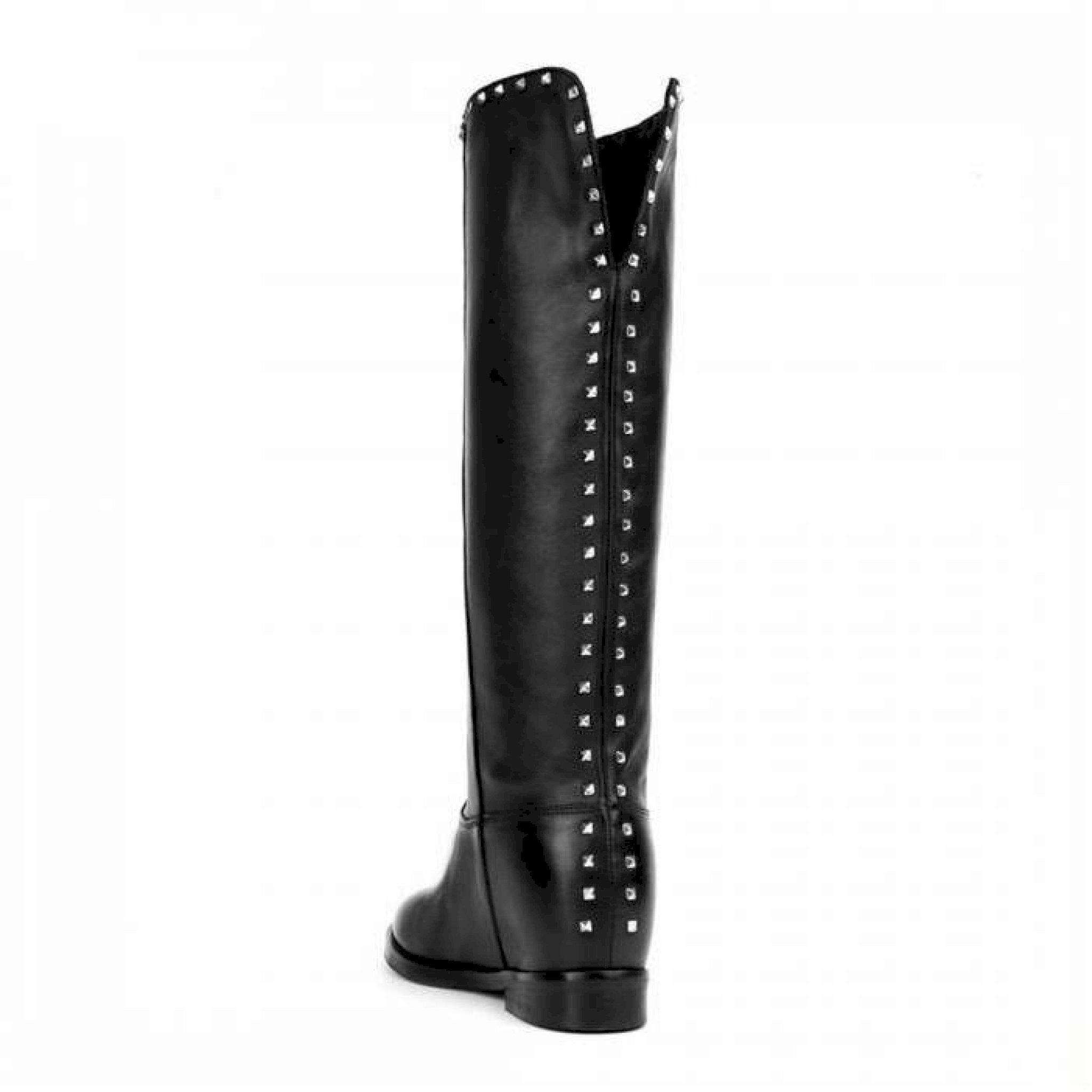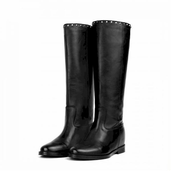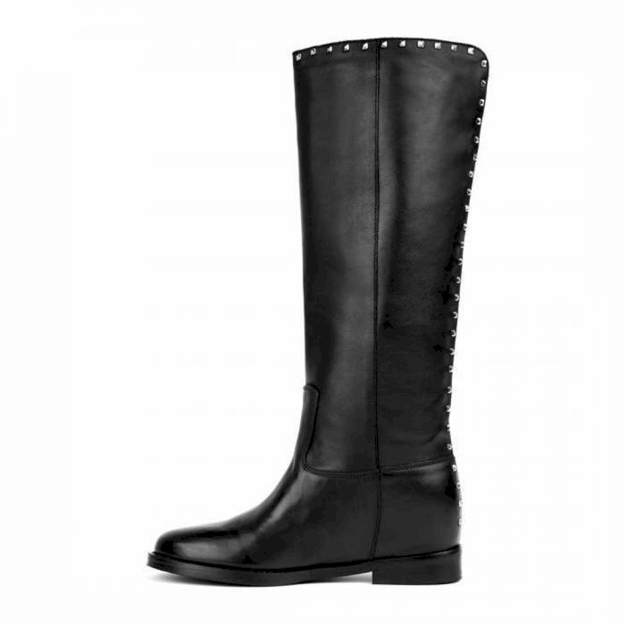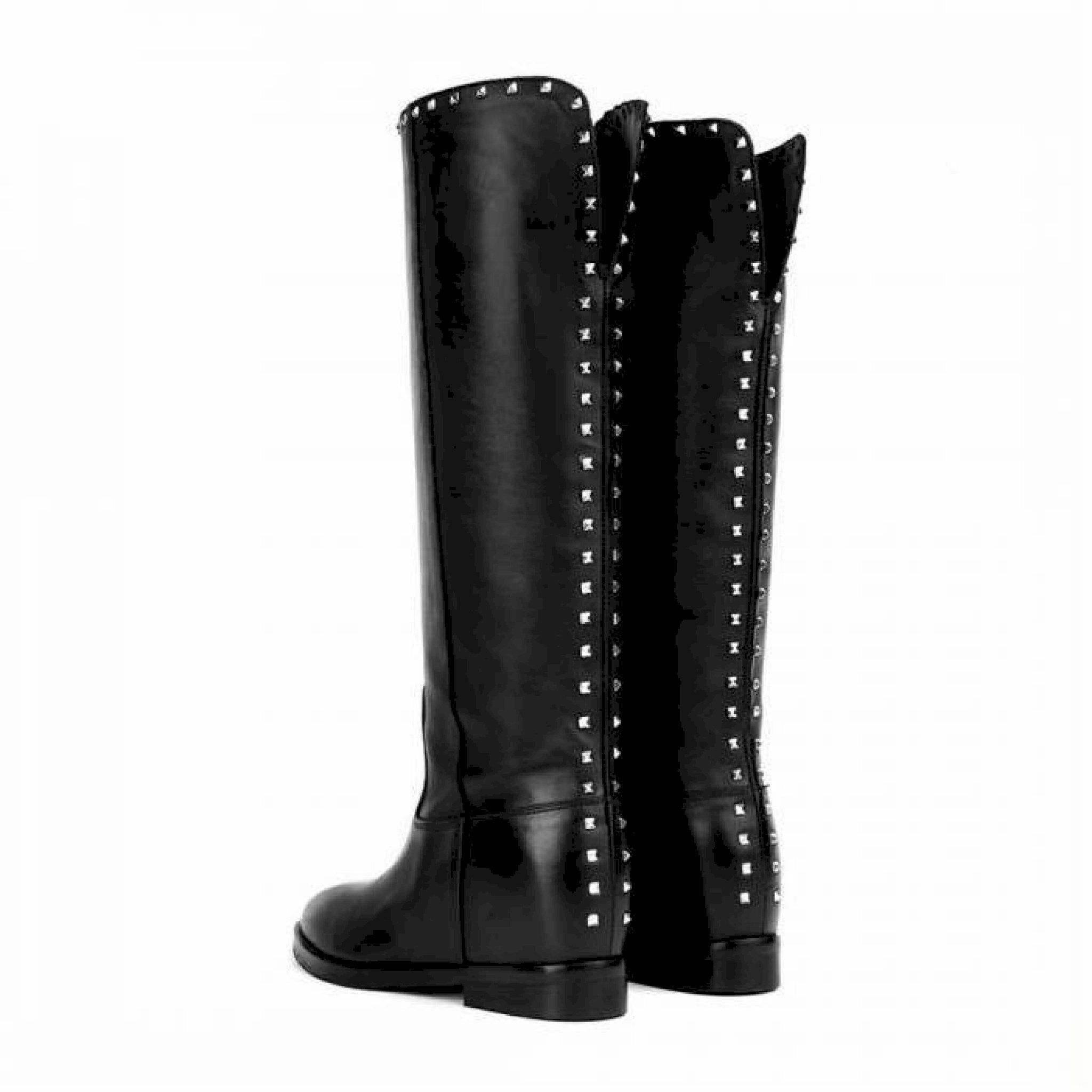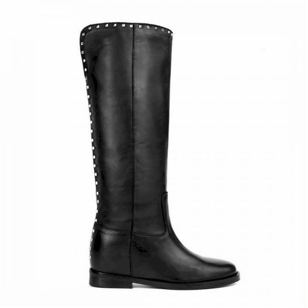 Stivale in pelle nera con profilo posteriore e bordo arricchiti da borchiette color argento, zeppetta interna 4 cm