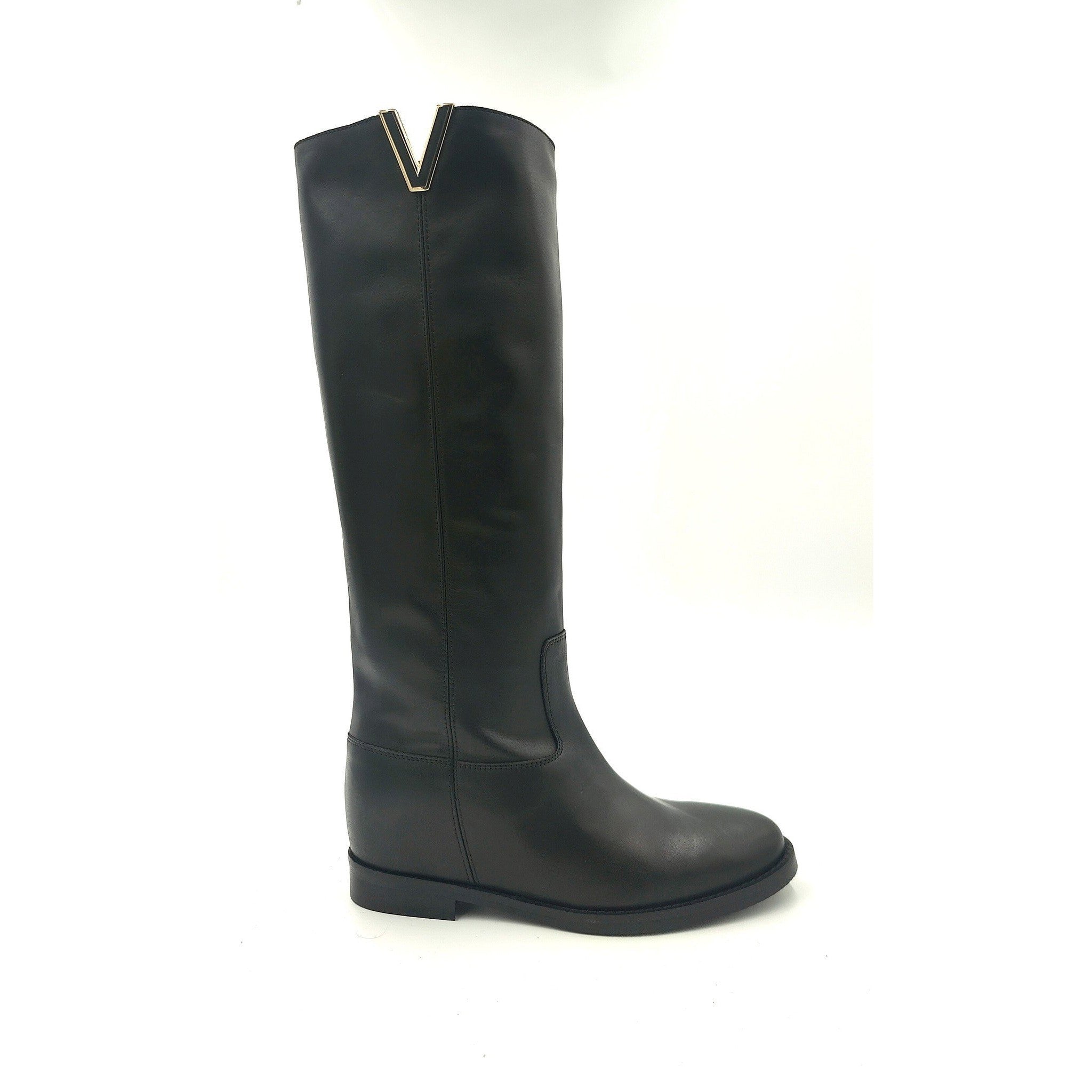 Stivale in pelle nera con apertura laterale a v color oro e zeppetta interna 4 cm
