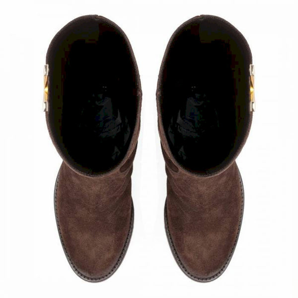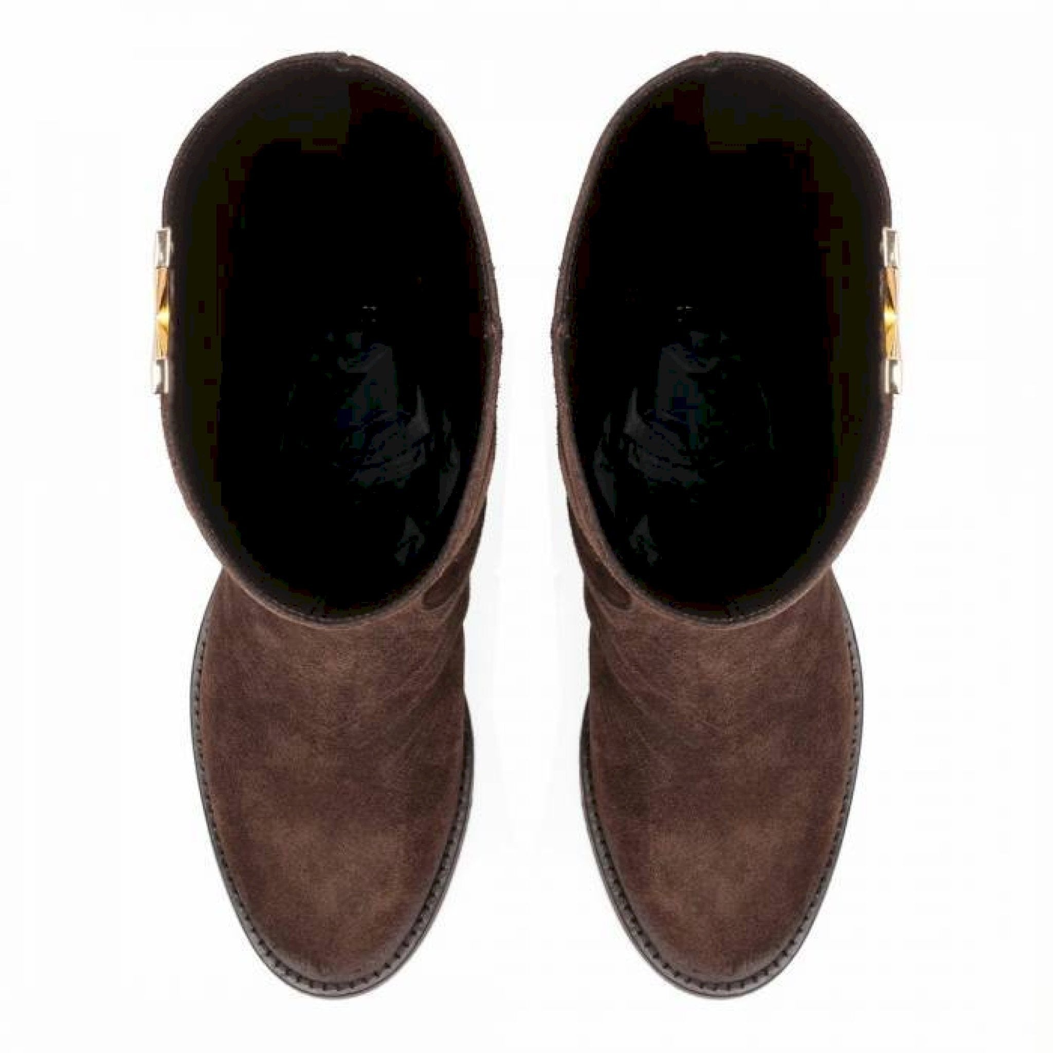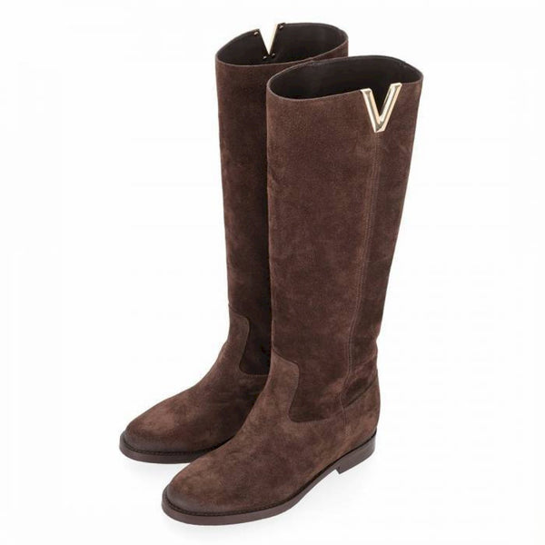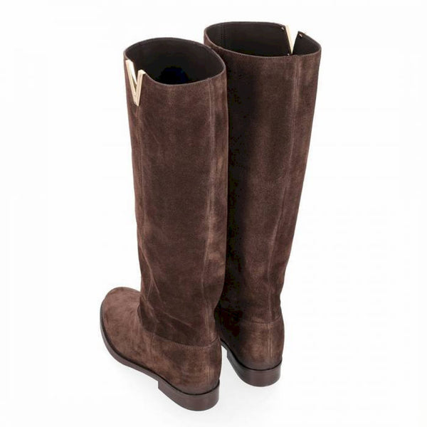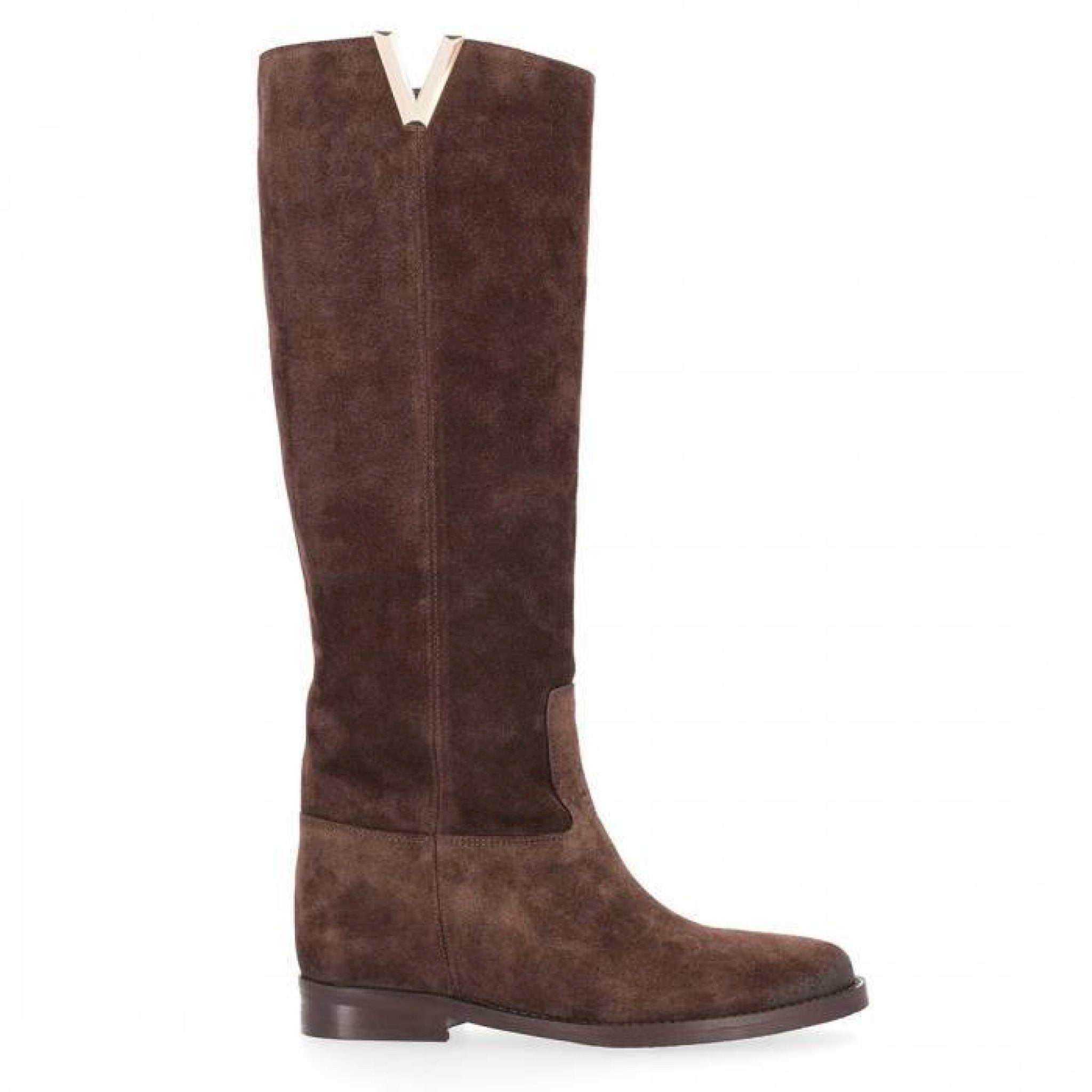 Stivale in pelle scamosciata con apertura laterale a v color oro e zeppetta interna 4 cm