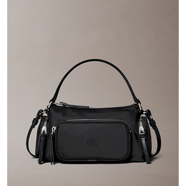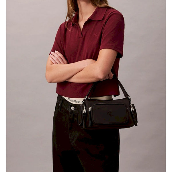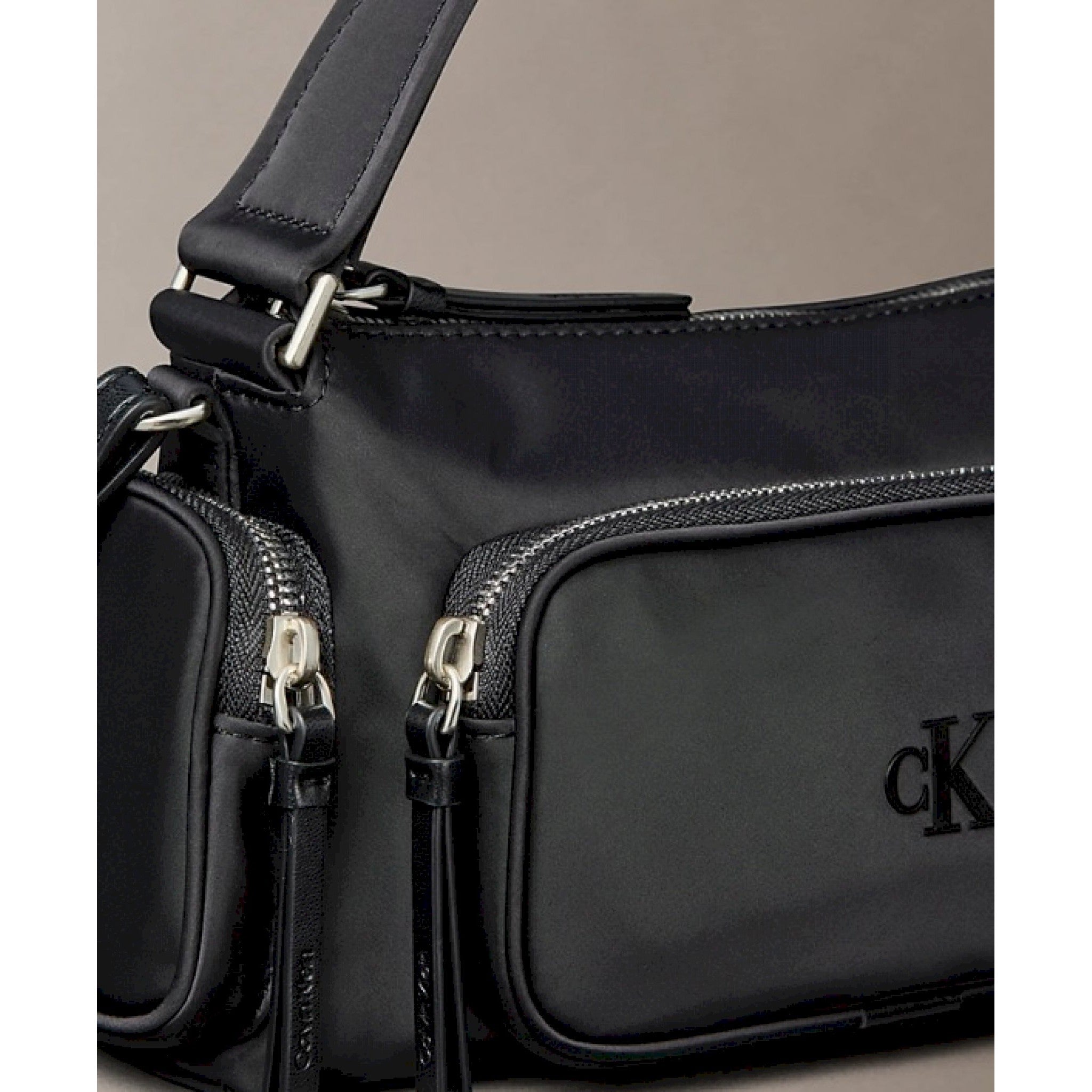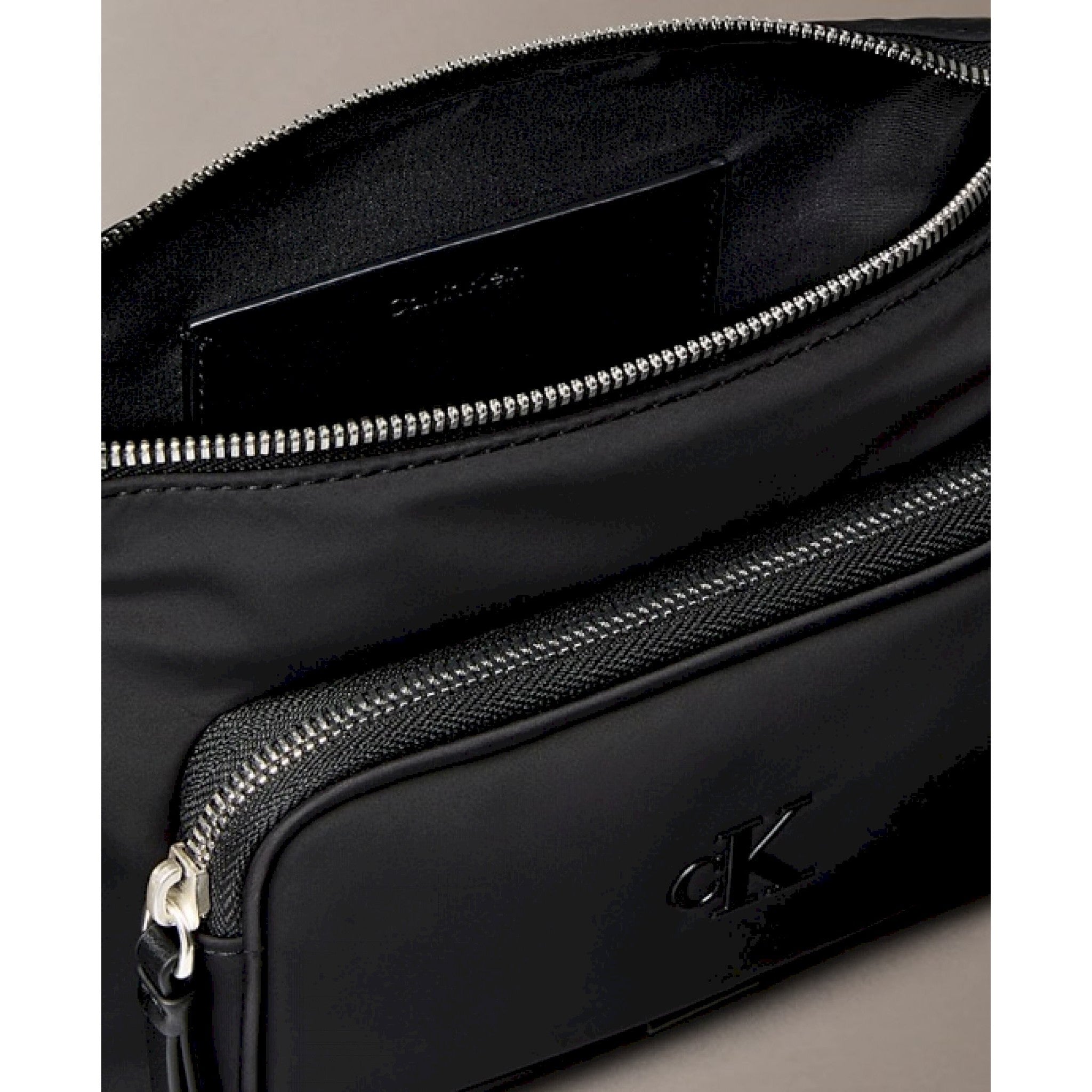 Esterno in nylon leggermente imbottito • 1 manico superiore fisso/tracolla • tracolla incrociata regolabile opzionale • chiusura con zip con cursore allungato • scomparti esterni con zip sul davanti e ai lati • tasca interna per carte di credito • monogramma calvin klein in rilievo tono su tono sul davanti forma e vestibilità • a: 14,5 cm l: 24 cm l: 6,5 cm composizione e cura 100% poliestere paese d'origine: cina