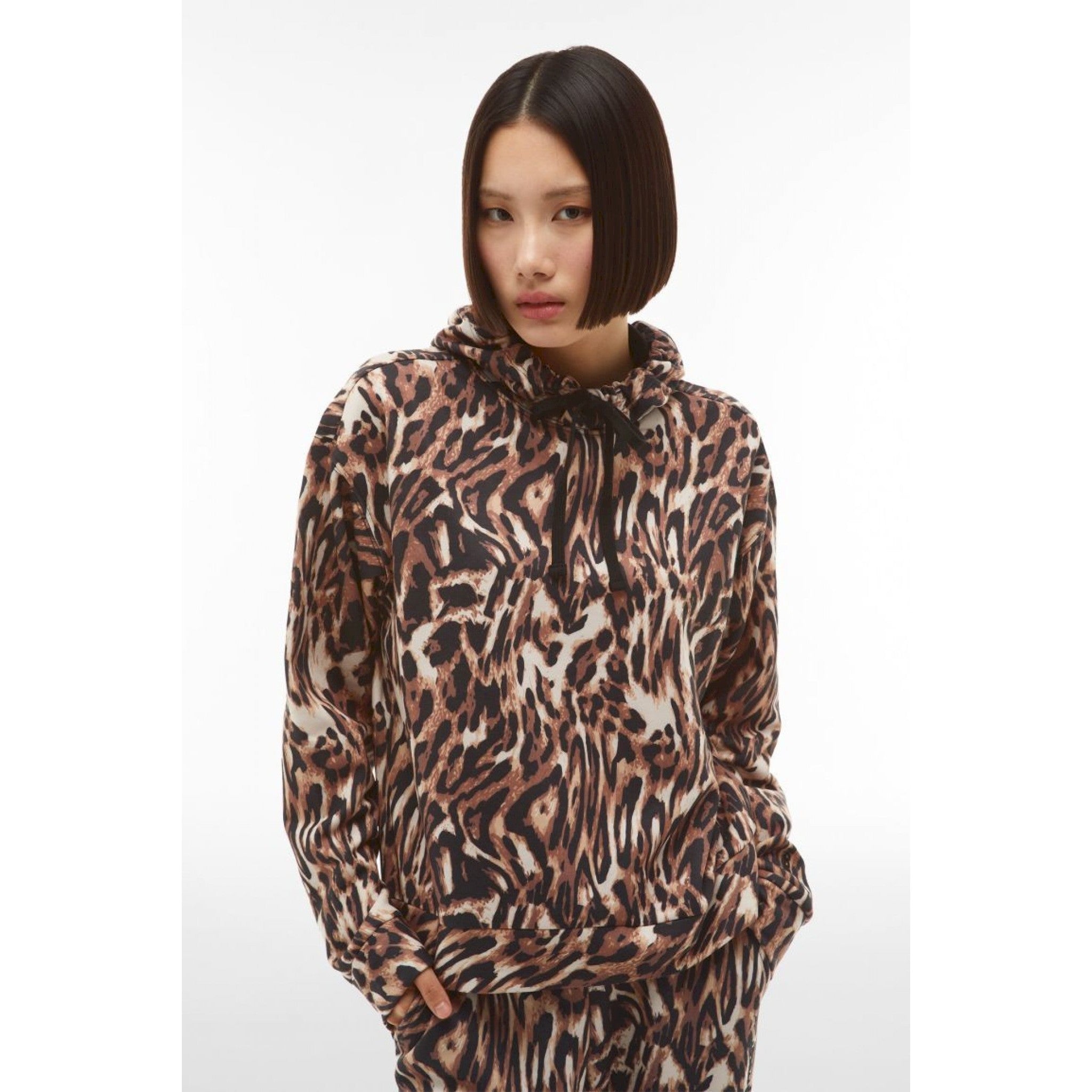 Felpa con vestibilità comfort stampata all-over con fantasia animalier macro. ha cappuccio doppiato in jersey e dotato di coulisse, maniche con spalla scesa, fondo e polsini nel tessuto principale del capo. la stampa di colore nero sul fondo manica completa i dettagli di stile.