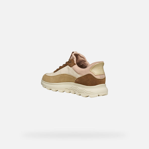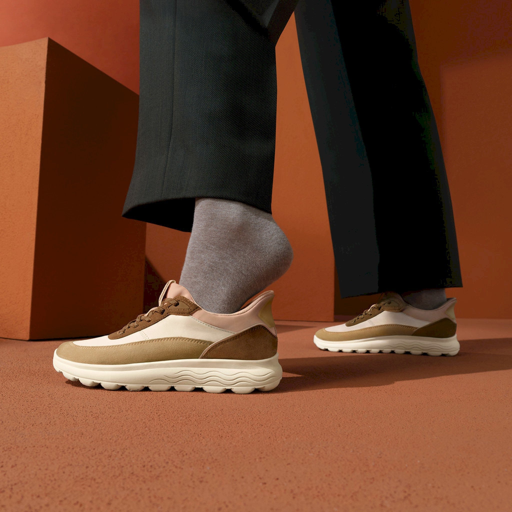 Sneaker donna dal design contemporaneo con sistema che permette un indosso veloce senza l'uso delle mani, garantendo elevato comfort durante la camminata. in questa versione beige e marrone, è realizzata in morbida nappa impreziosita da dettagli in scamosciato per un look sofisticato e versatile. spherica™ plus offre un'ammortizzazione ottimale che regala una spinta in più ad ogni passo, perfetta per un lifestyle urbano e dinamico.