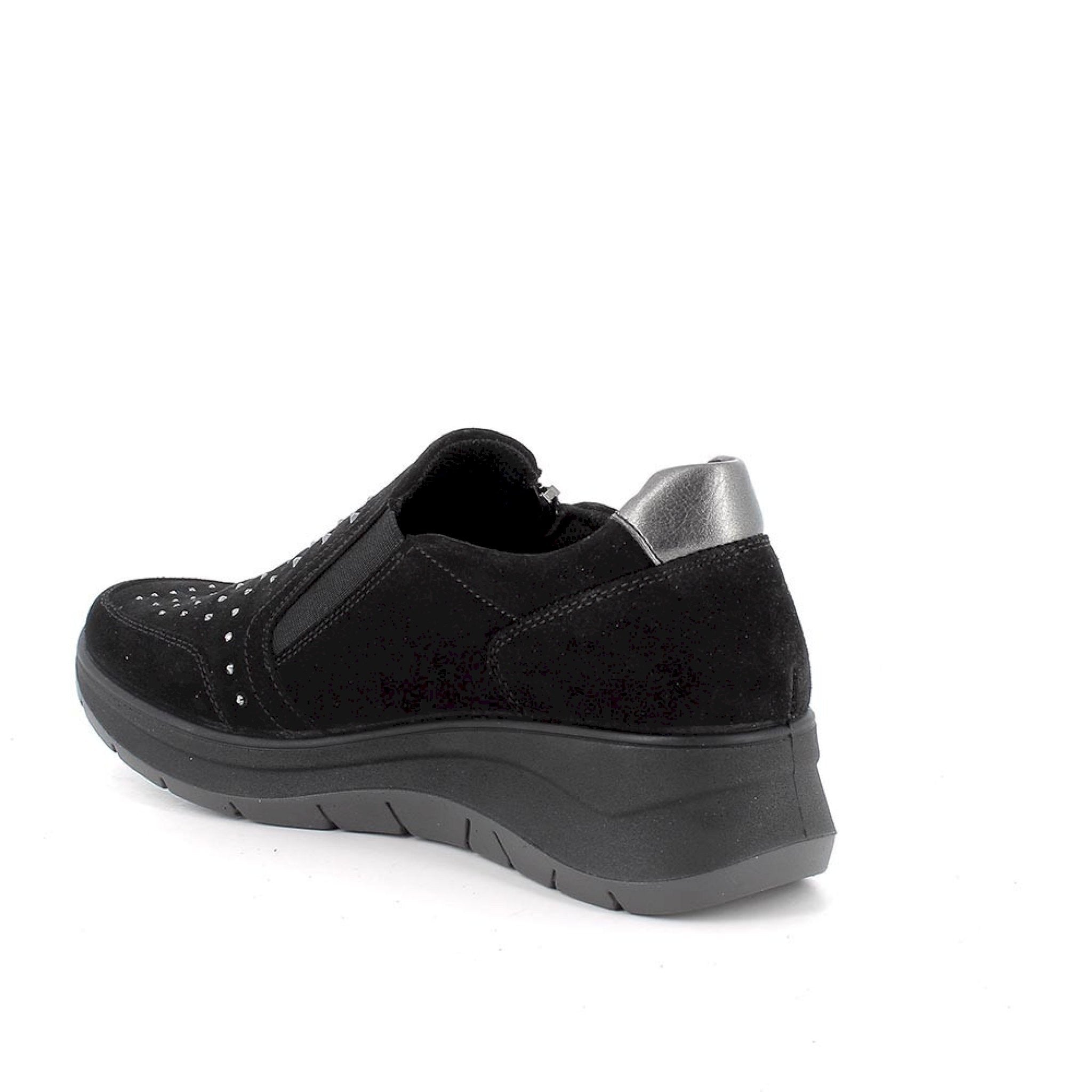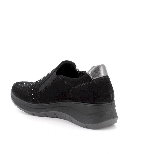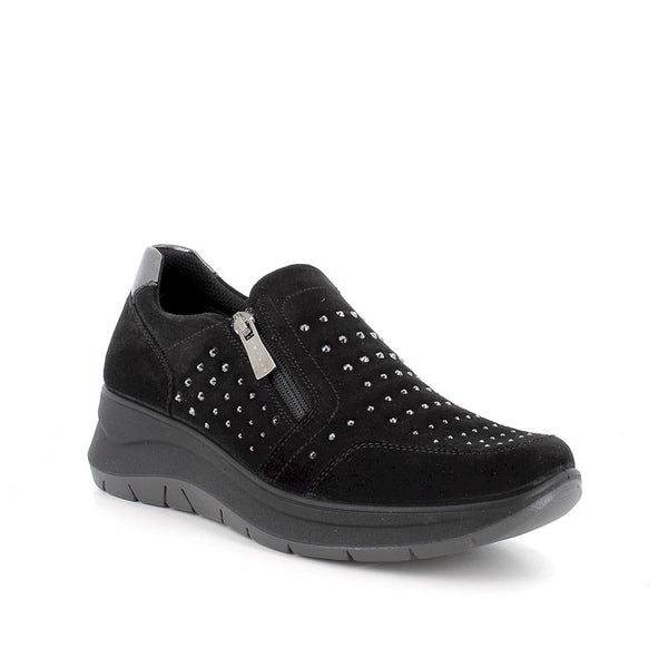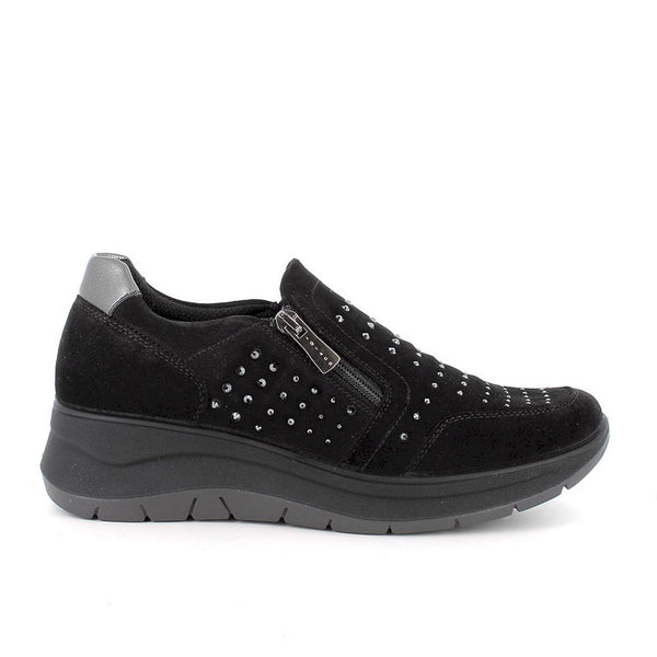 Slip on con leggera zeppa che assicura una comoda camminata. queste calzature sono realizzate in morbida pelle scamosciata decorata con strass. chiusura con elastico interno più zip laterale per una facile calzata. il sottopiede estraibile in pelle garantisce massima igiene.