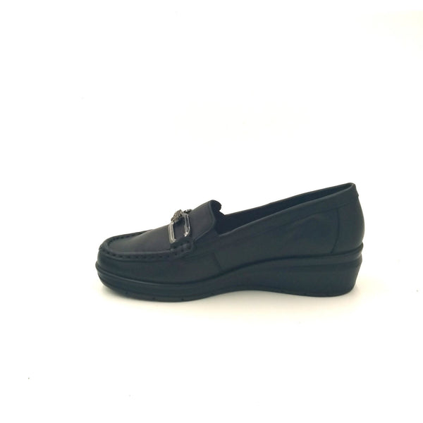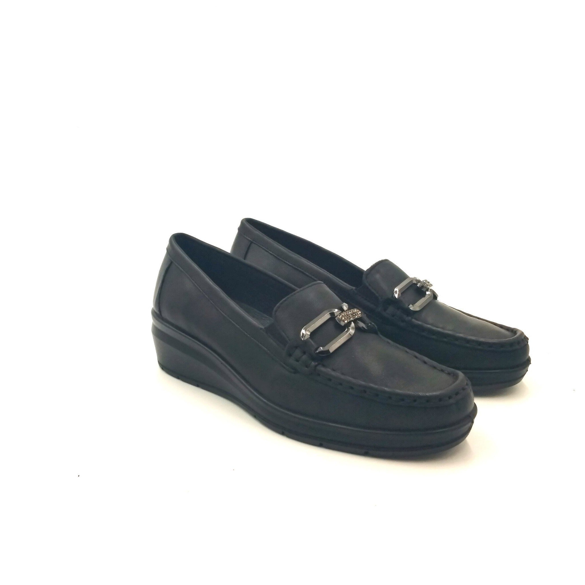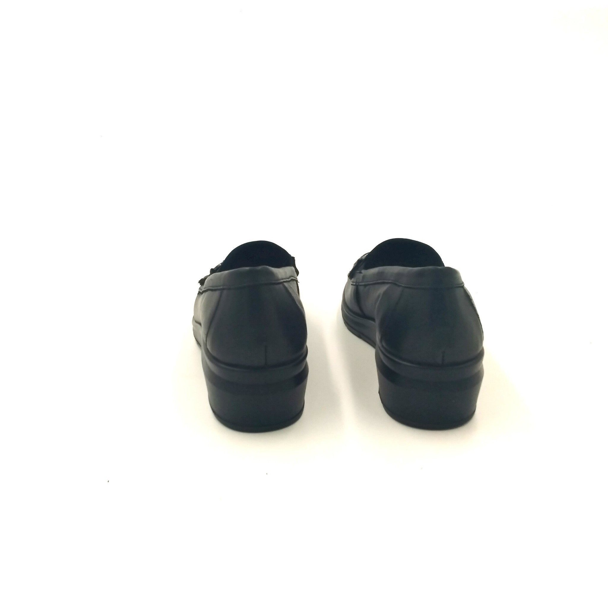 Mocassini in pelle con leggera zeppa per una calzata molto comoda. morsetto ornamentale, vaschetta cucita ed elastici per facilitare la calzata. fodera e sottopiede in pelle per massima igiene. sottopiede memory foam per ammortizzare gli urti della camminata e garantire massimo sollievo al piede.