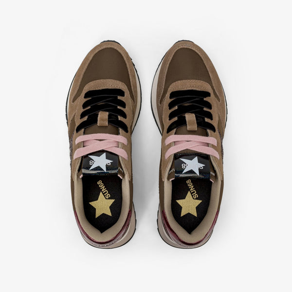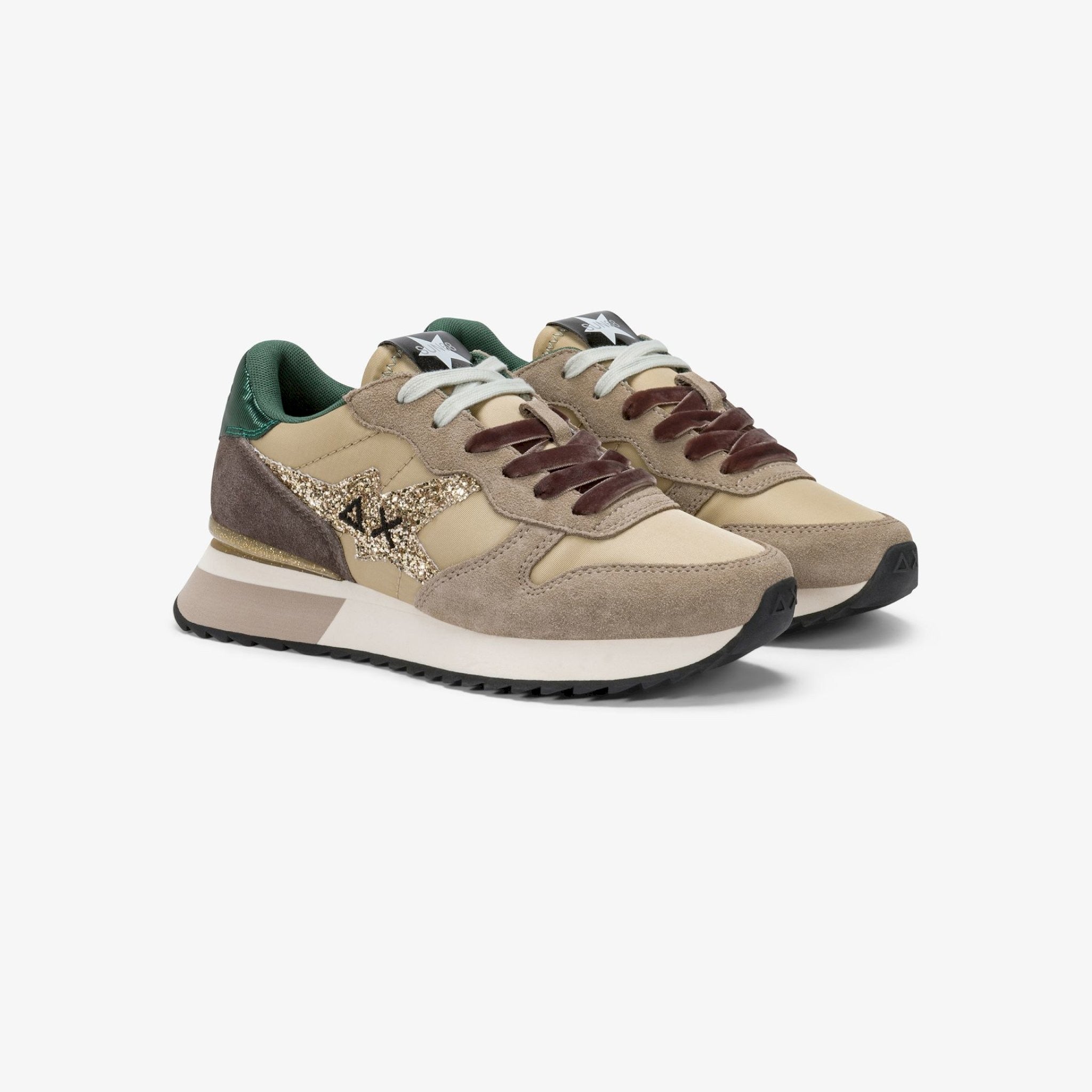 Innovativa, leggera ed estremamente femminile, stargirl glitter è la sneaker sun68 che illumina i look quotidiani. la patch con glitter sul lato reinterpreta il logo in chiave moderna, mentre lo spoiler sul retro è rifinito con materale effetto snake.