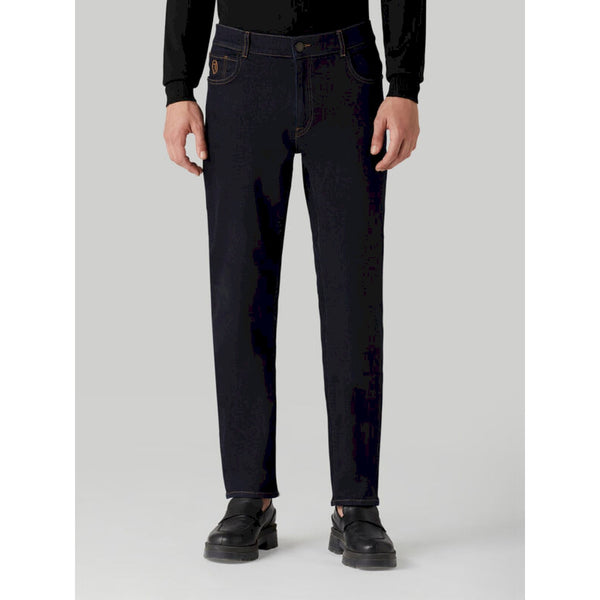 Jeans 5 tasche 380 icon realizzato in denim di cotone leggermente elastico. le cuciture a contrasto color tabacco evidenziano la linea dritta e i dettagli tradizionali. il modello è rifinito con dettaglio monogram ricamato a contrasto sul taschino orologio, rivetti in metallo e salpa logata sul retro. chiusura con zip coperta e bottone a chiodo.