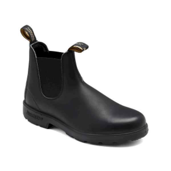 Stivaletti classici in stile chelsea della serie originals modello blundstone #510, realizzati in pelle nera impermeabile. presentano tomaia liscia con classici elastici laterali e impuntura frontale per un tocco fashion. linguetta anteriore e posteriore per aiutarvi nella calzata, suola in gomma dentata con tallone rialzato per una perfetta aderenza al terreno. si caratterizzano per il look grintoso che li rende perfetti ad abbinamenti casual