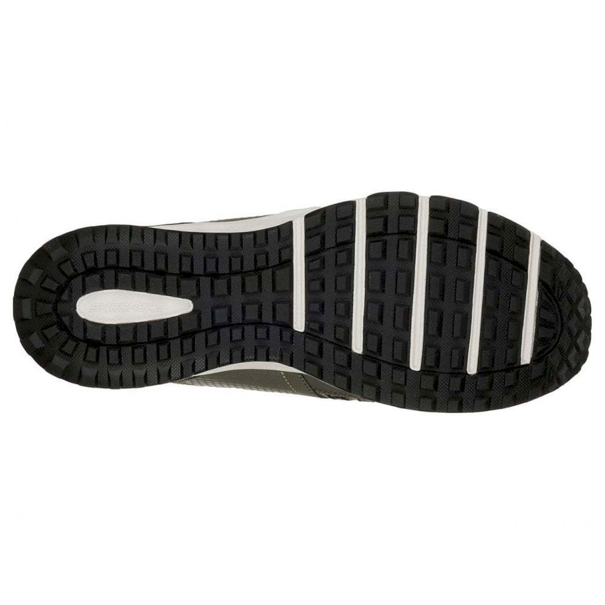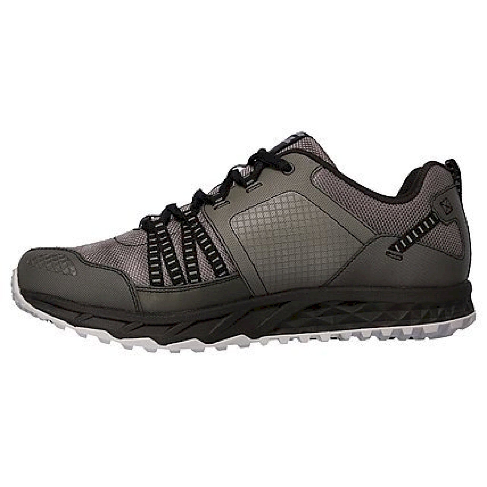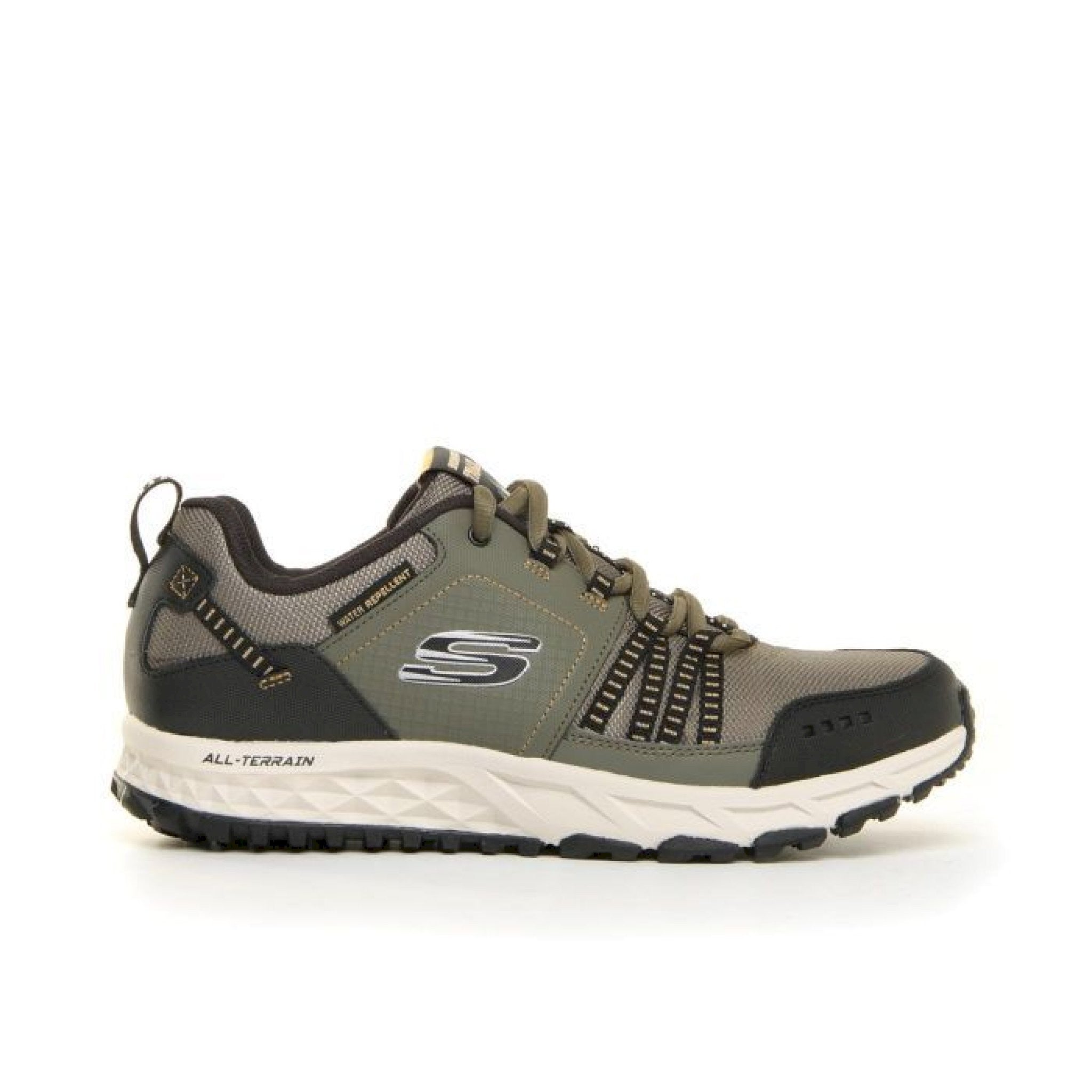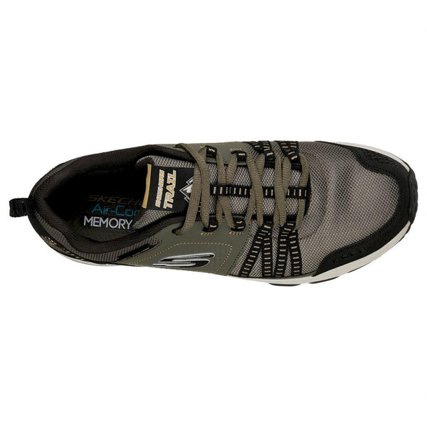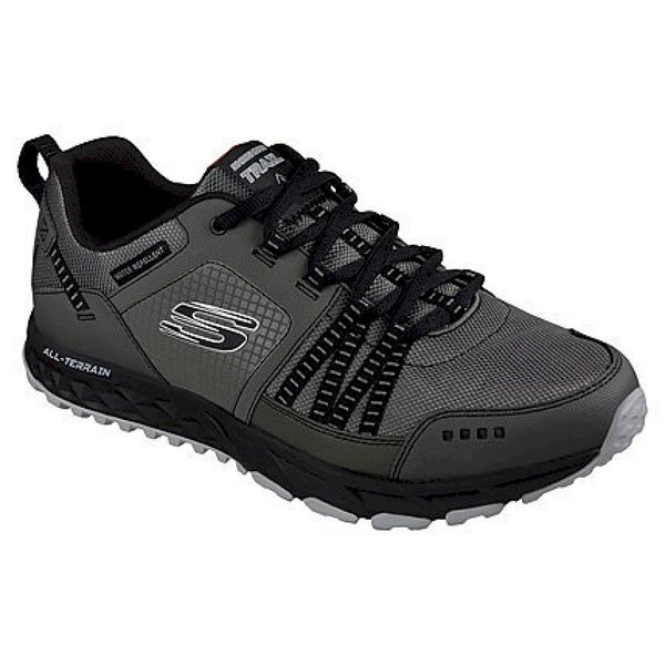 Domina il terreno con stile e comfort con la scarpa skechers escape plan. tomaia in pelle, tessuto sintetico e mesh in una sneaker da allenamento e da passeggio da pista sportiva con lacci con cuciture, sovrapposizione e accenti di perforazione. soletta in memory foam raffreddata ad aria