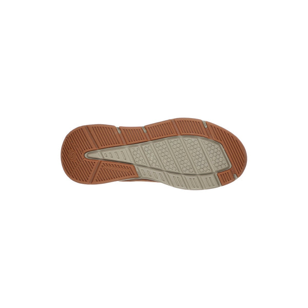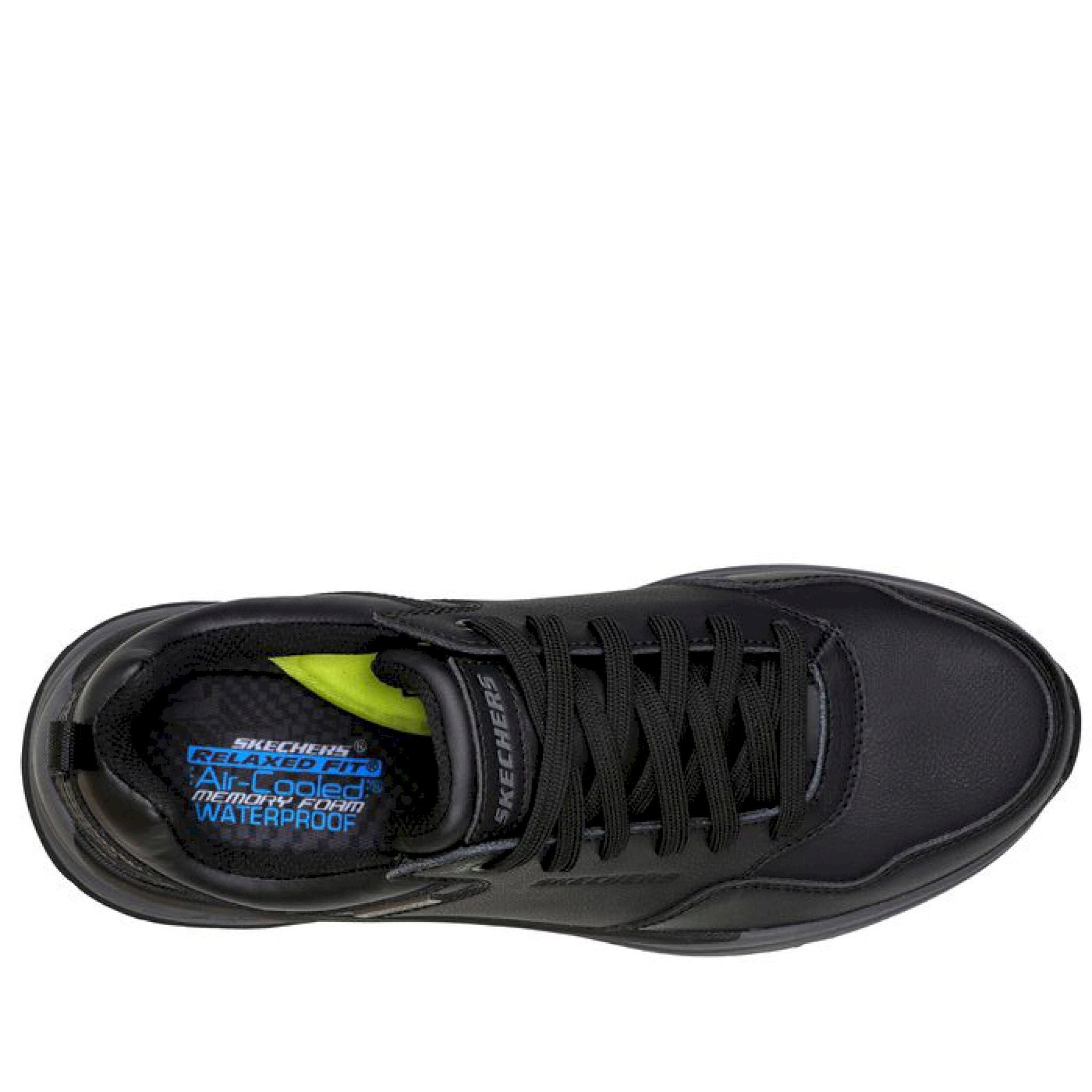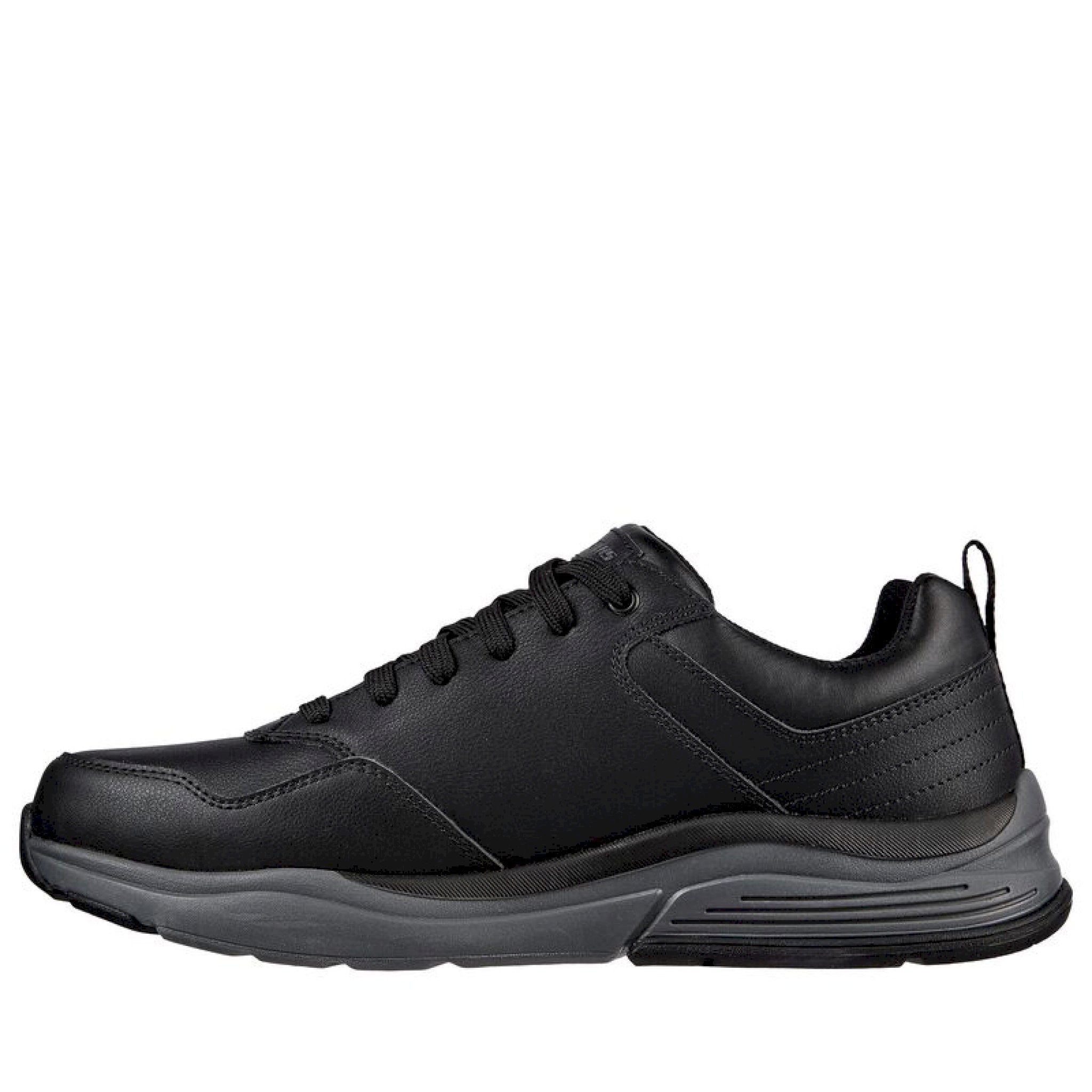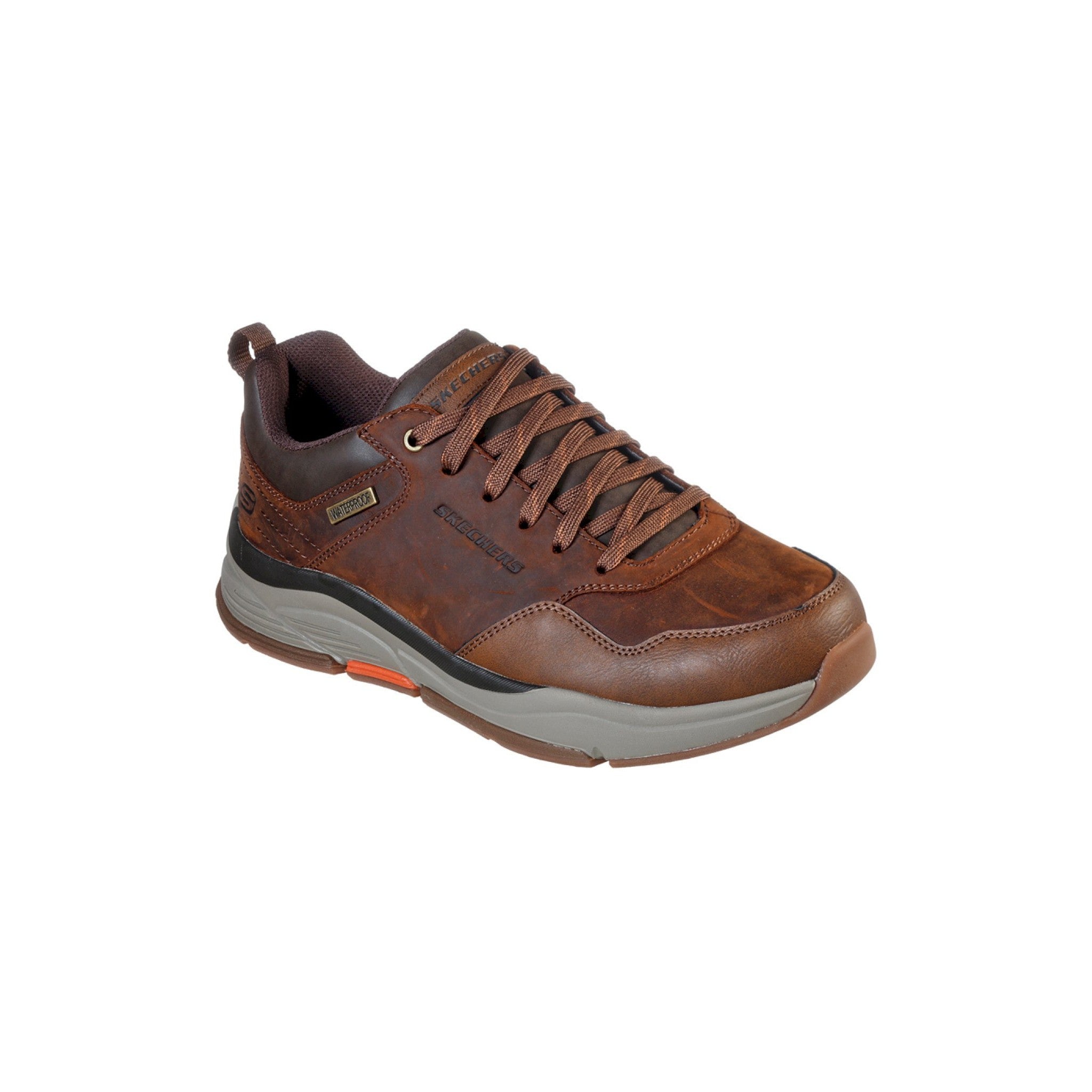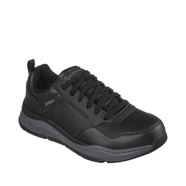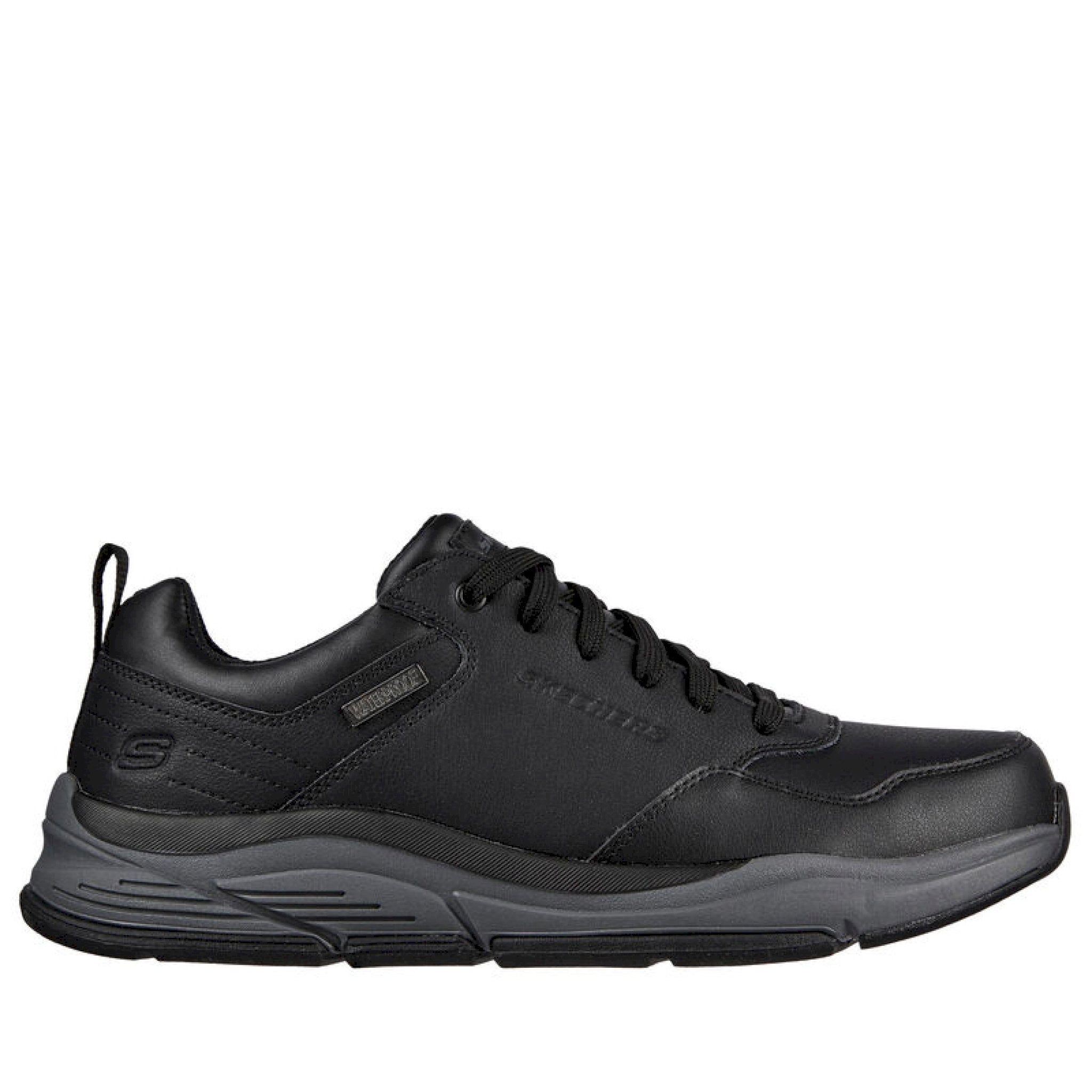 Stile e comfort si uniscono nella skechers relaxed fit® impermeabile: benago - hombre. caratterizzata da una tomaia in morbida pelle oliata con lacci, una soletta skechers air-cooled memory foam® e un'intersuola flessibile e confortevole.