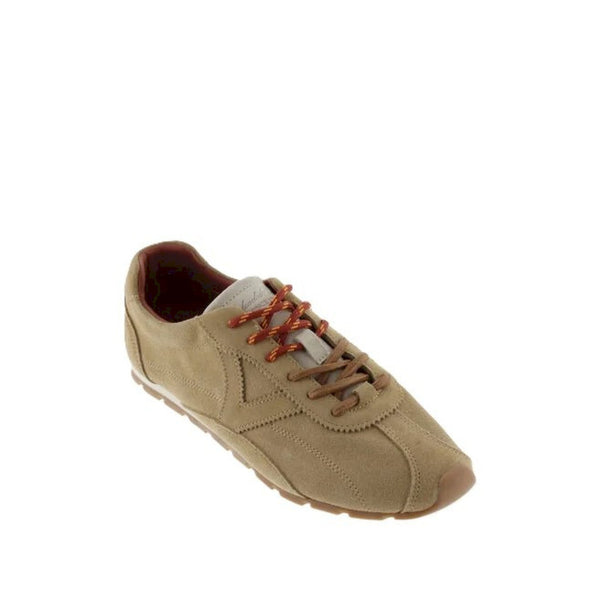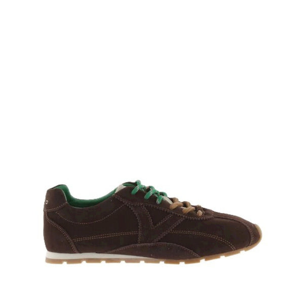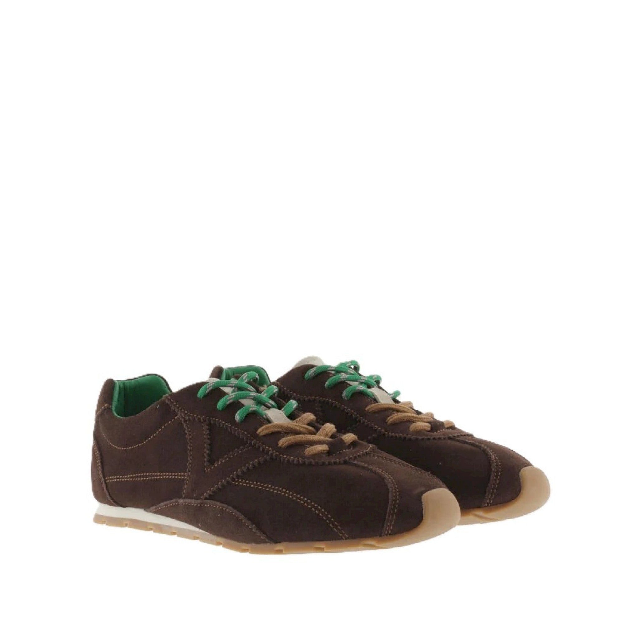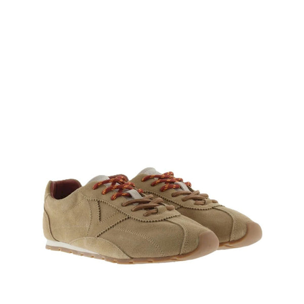 Sneakers da donna in suede con cuciture a contrasto. chiusura con doppi lacci: uno tono su tono e uno mélange, in tinta con la fodera interna. logo del brand ricamato in bianco sul retro. suola bicolore con battistrada dentellato color caramello per una migliore aderenza.