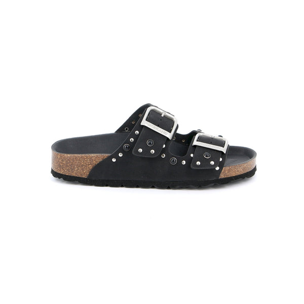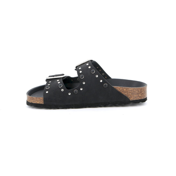 Leggero platform per slanciare la figura e sottopiede re-soft ammortizzante per offrirti il massimo comfort. la nuova linea enny è la versione più glamour e chic delle nostre ciabatte in sughero. il nero non passa mai di moda ed è sempre elegante. ne è la prova questa versione total black con borchie.