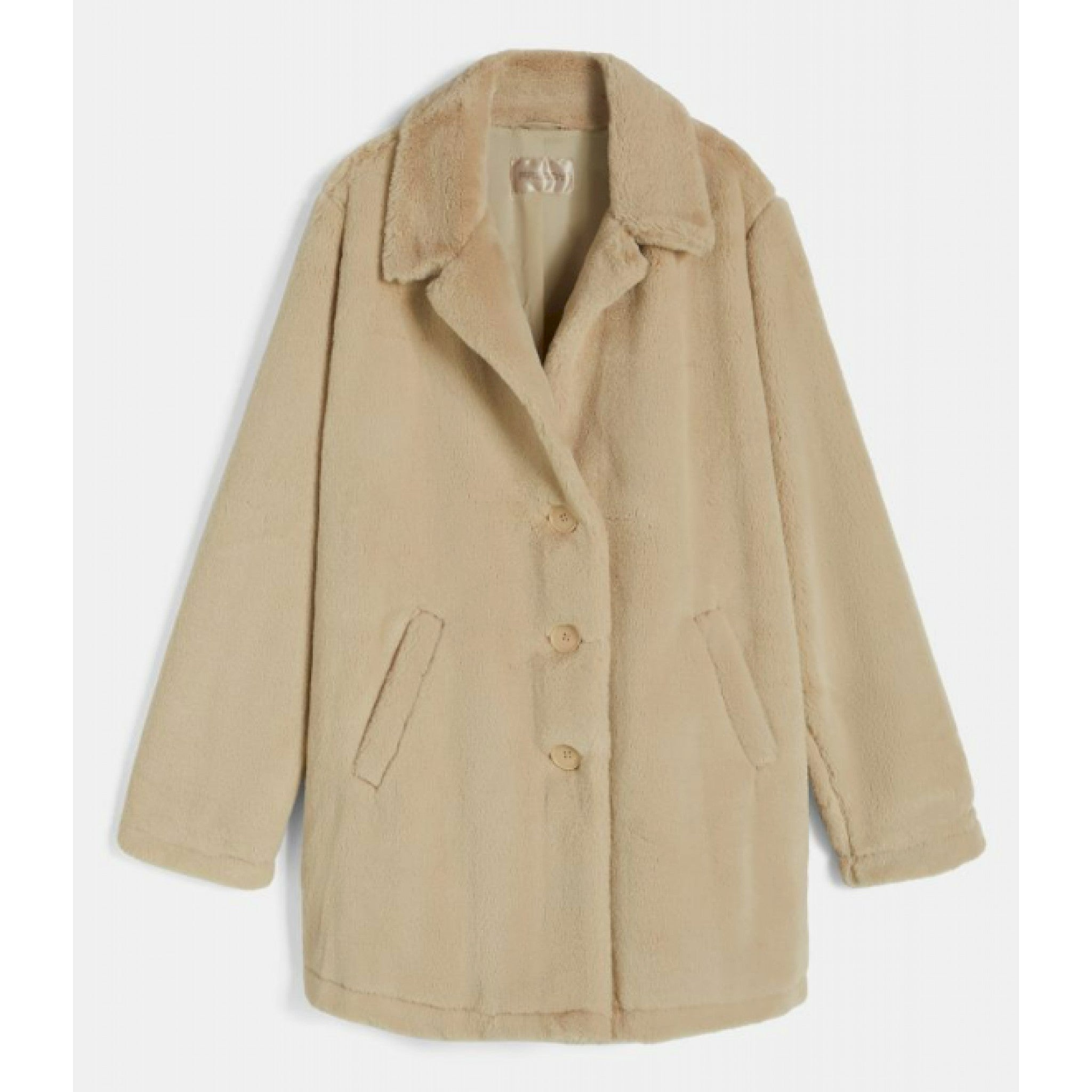 Cappotto monopetto lungo ai fianchi in pelliccia sintetica con fodera in tono colore opaca. il modello veste regular e presenta chiusura con bottoni in tono colore e tasche frontali a filetto. il logo applicato sul fondo manica sinistra completa i dettagli di stile