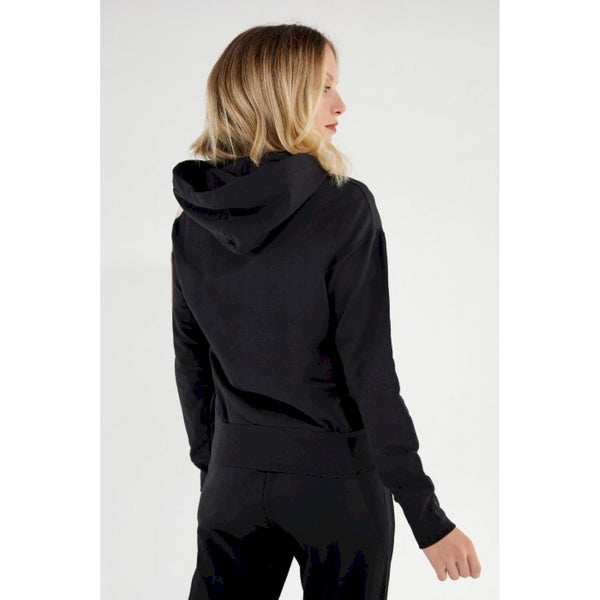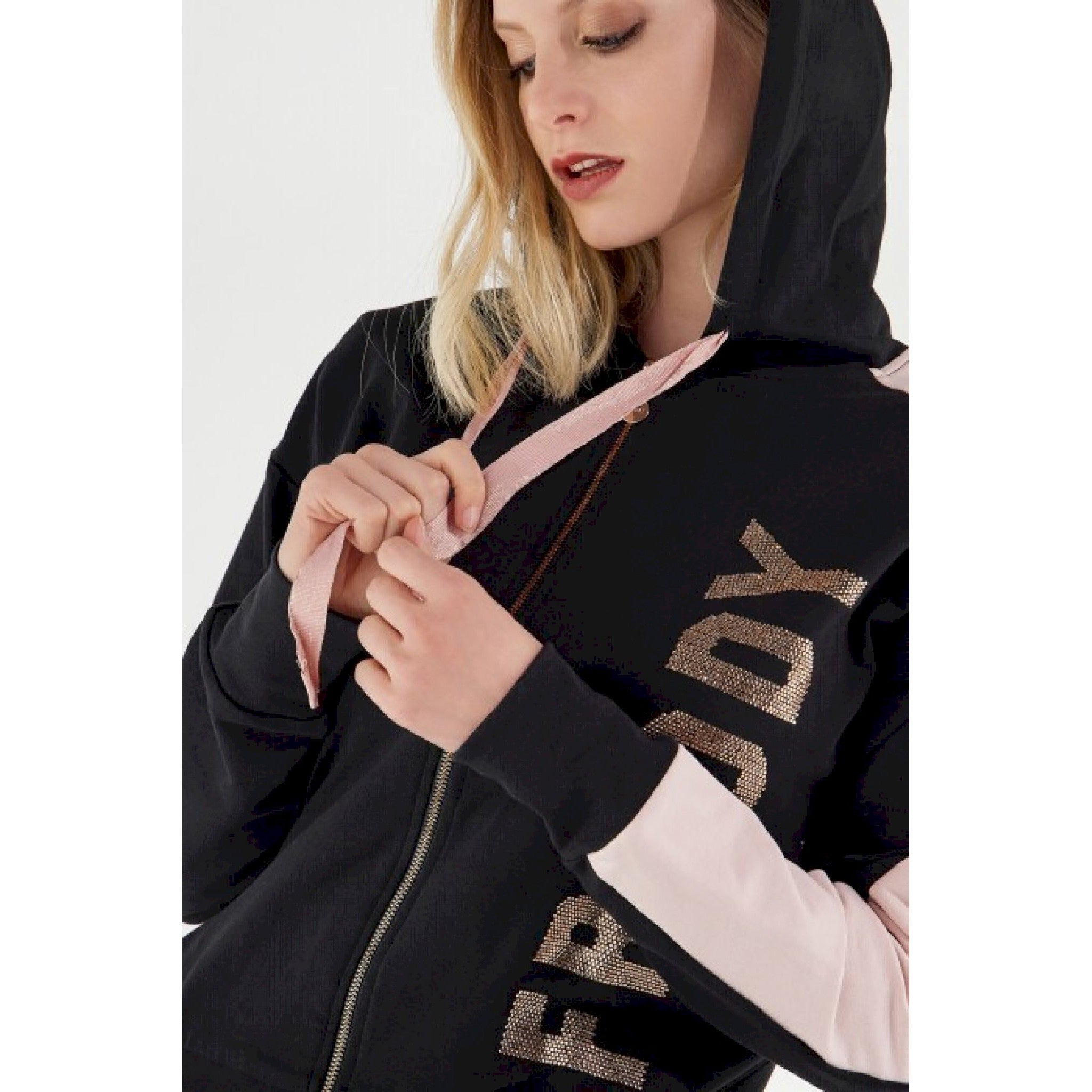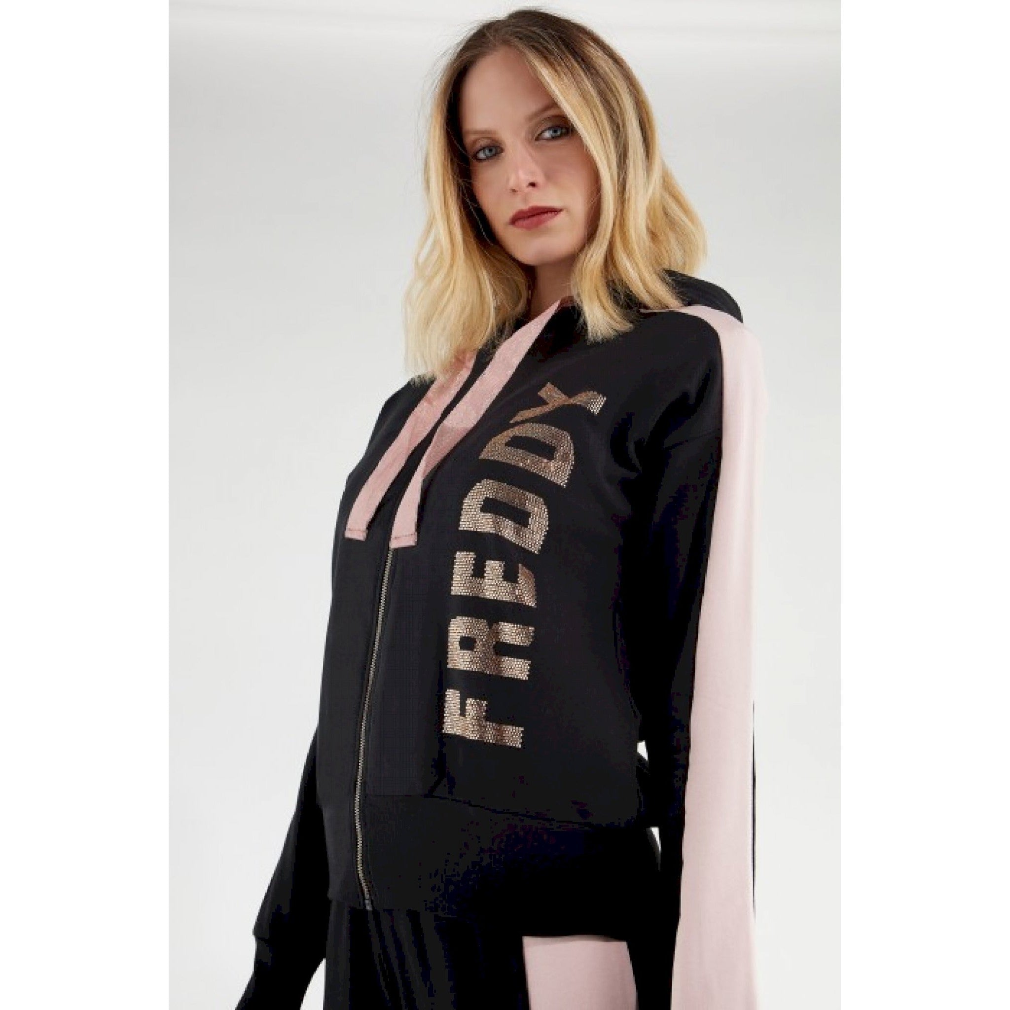 Felpa elasticizzata decorata sul fronte da grande lettering freddy verticale realizzato in strass e inserto in tessuto a contrasto colore che percorre una spalla e una manica. il modello presenta cappuccio regolabile con coulisse larga glitterata, zip in metallo a tutta lunghezza e puller rotondo, tasche interne, fondo alto in costina e polsini in costina. il design funzionale si unisce alla flessibilità del tessuto e ai dettagli dai toni femminili nell’esaltare il piacere per lo stile nel completare outfit sportivi e per il tempo libero all’insegna della comodità e libertà di movimento.