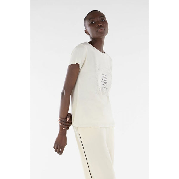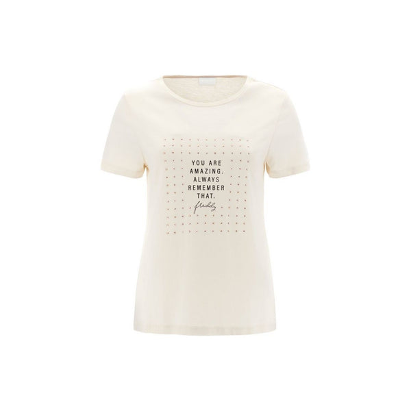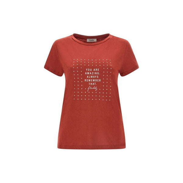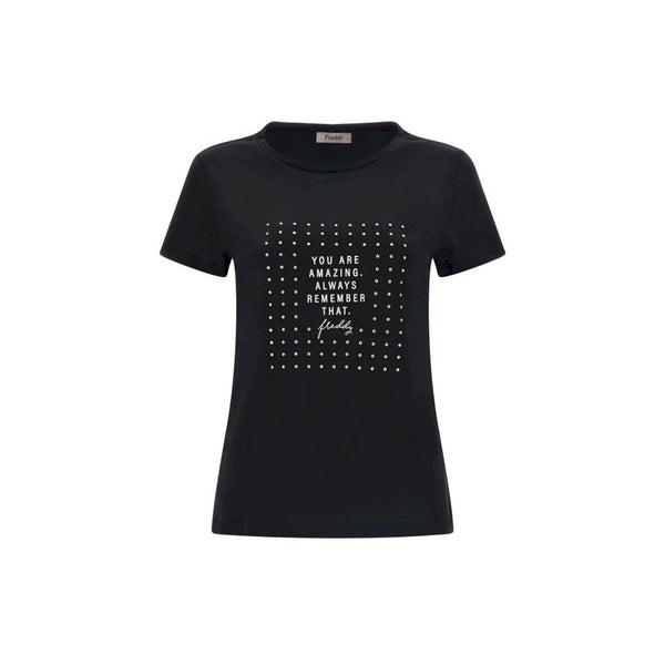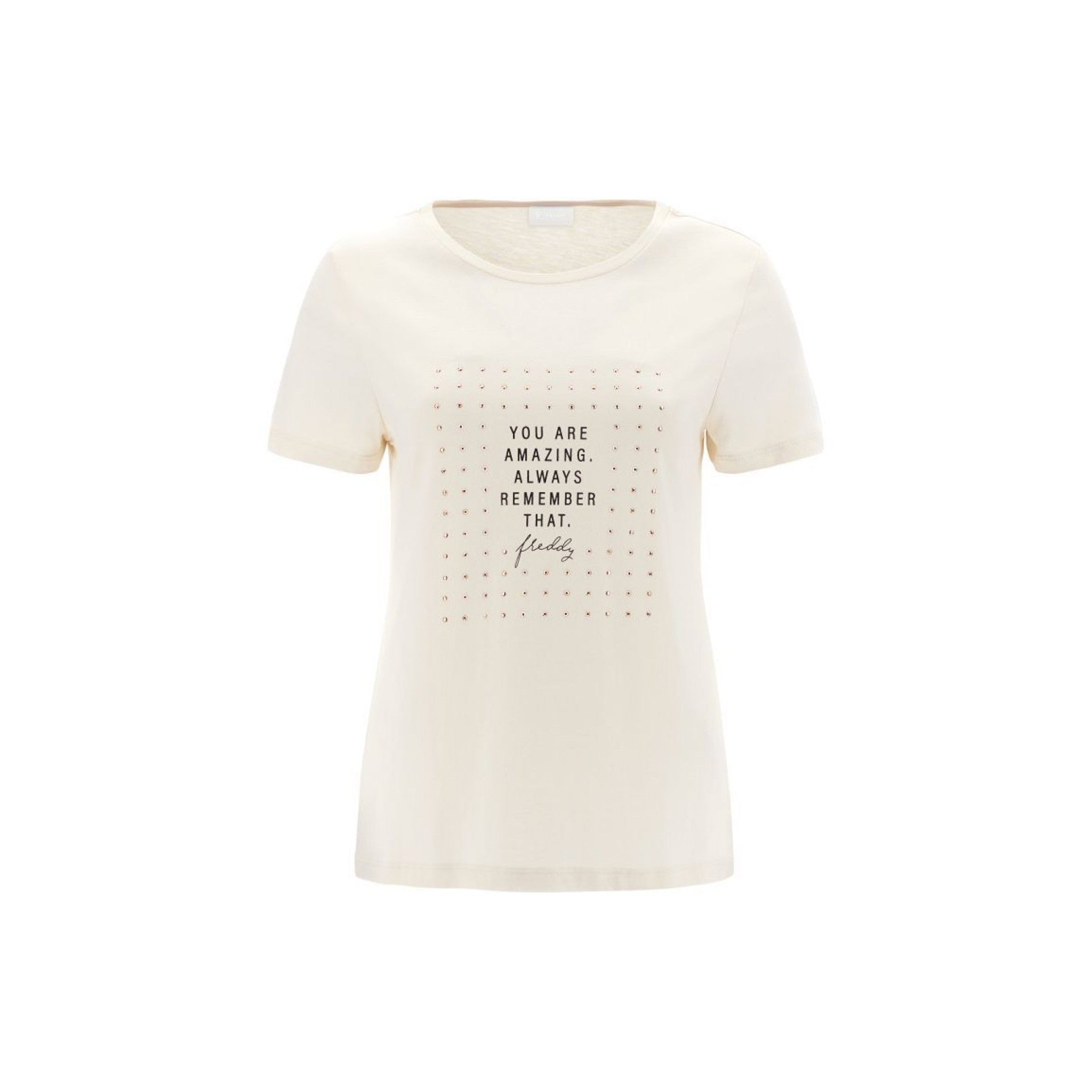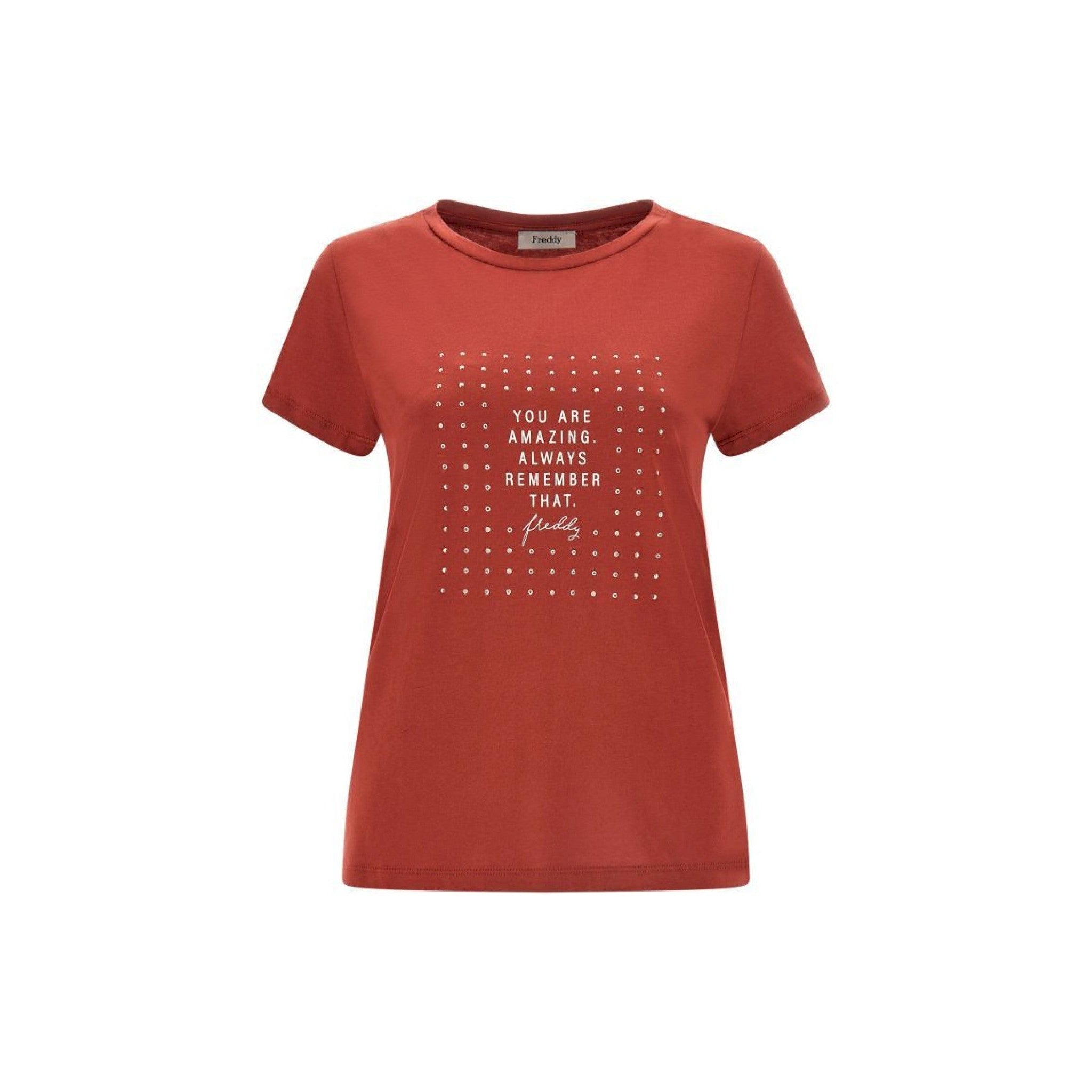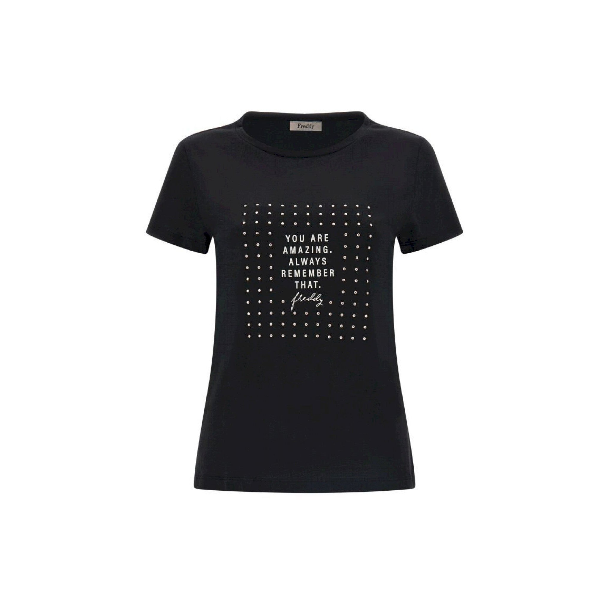 T-shirt in jersey modal impreziosita sulla parte frontale dalla grafica lettering firmata freddy incorniciata da un riquadro composto da borchie in colore oro rosa. ha scollo a girocollo, maniche corte e vestibilità regular