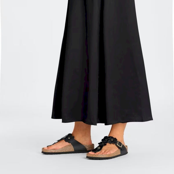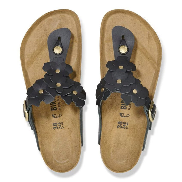 Il birkenstock gizeh è un autentico classico e un versatile modello alla moda. il nostro elegante sandalo infradito unisce una presa ottimale a un design minimalista e alla moda. questa è una versione particolarmente femminile del sandalo con delicati fiori applicati. la tomaia è realizzata in pregiata pelle anilina con una speciale lucentezza.