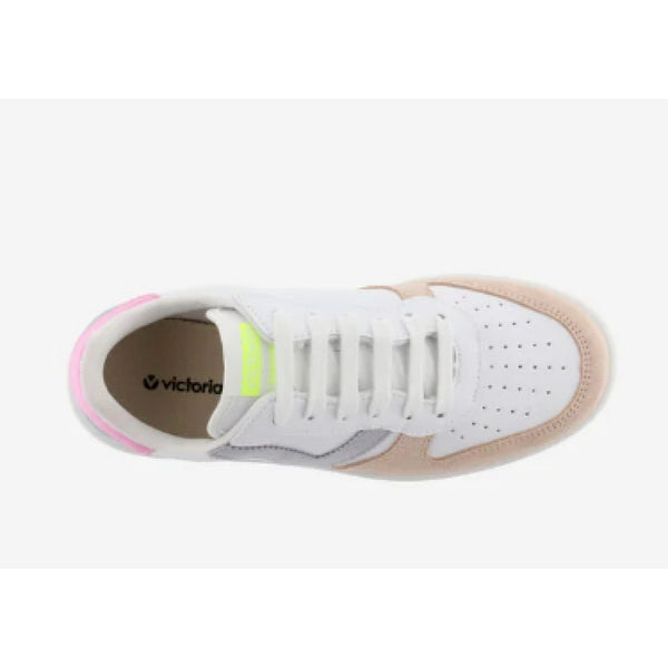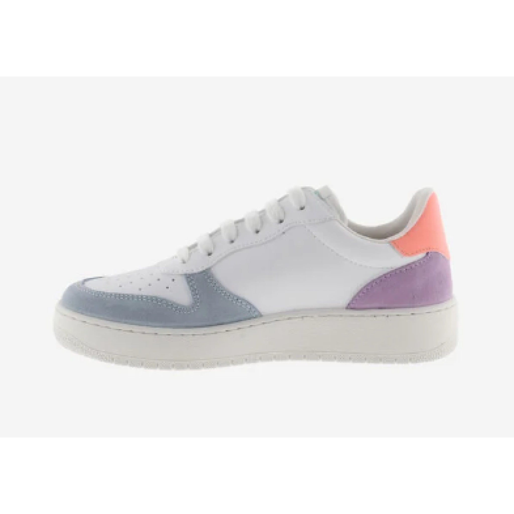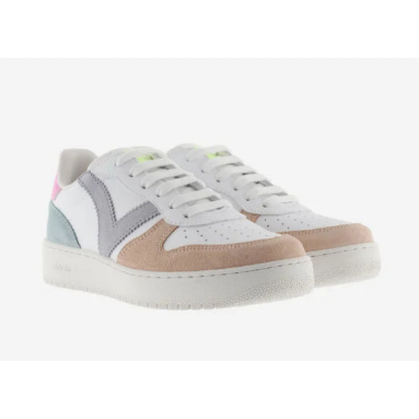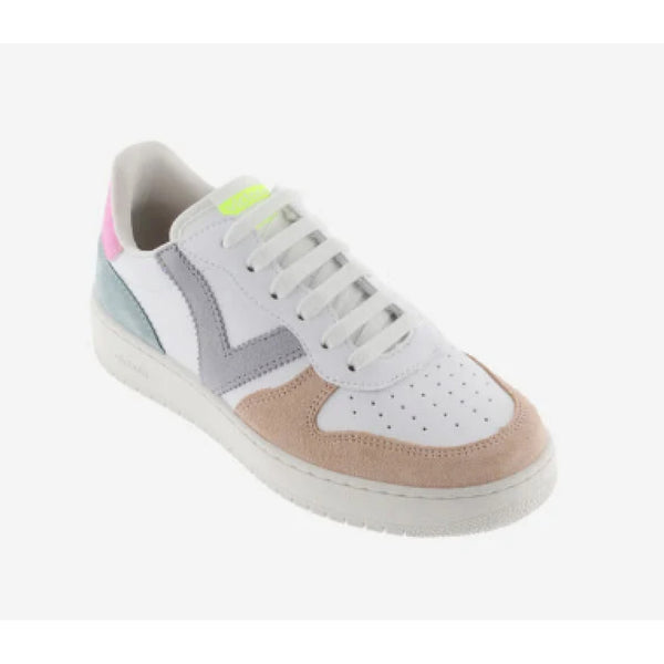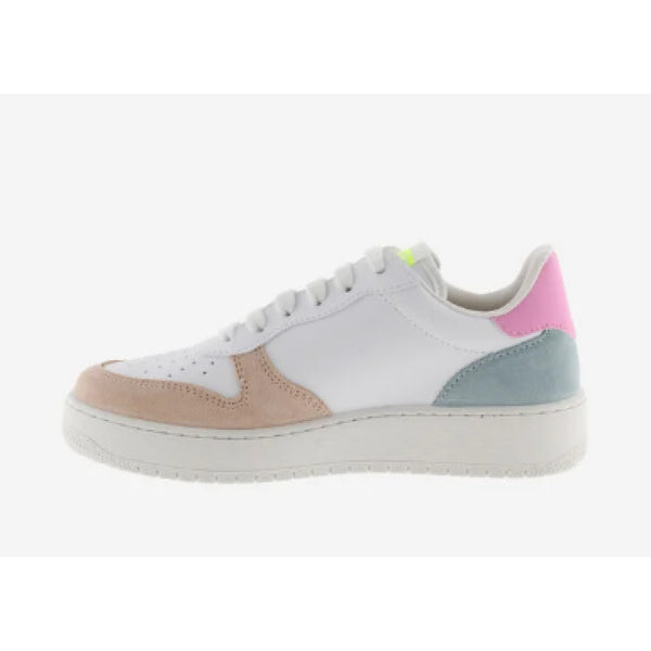 Sneakers bianche da donna, prodotte in spagna con materiale effetto pelle di alta qualità e inserti in crosta di cuoio multicolore. dettagli fluorescenti sul retro e sulla punta dei lacci. suola di 3 cm realizzata con oli vegetali anziché minerali per ridurre l'impatto ambientale.