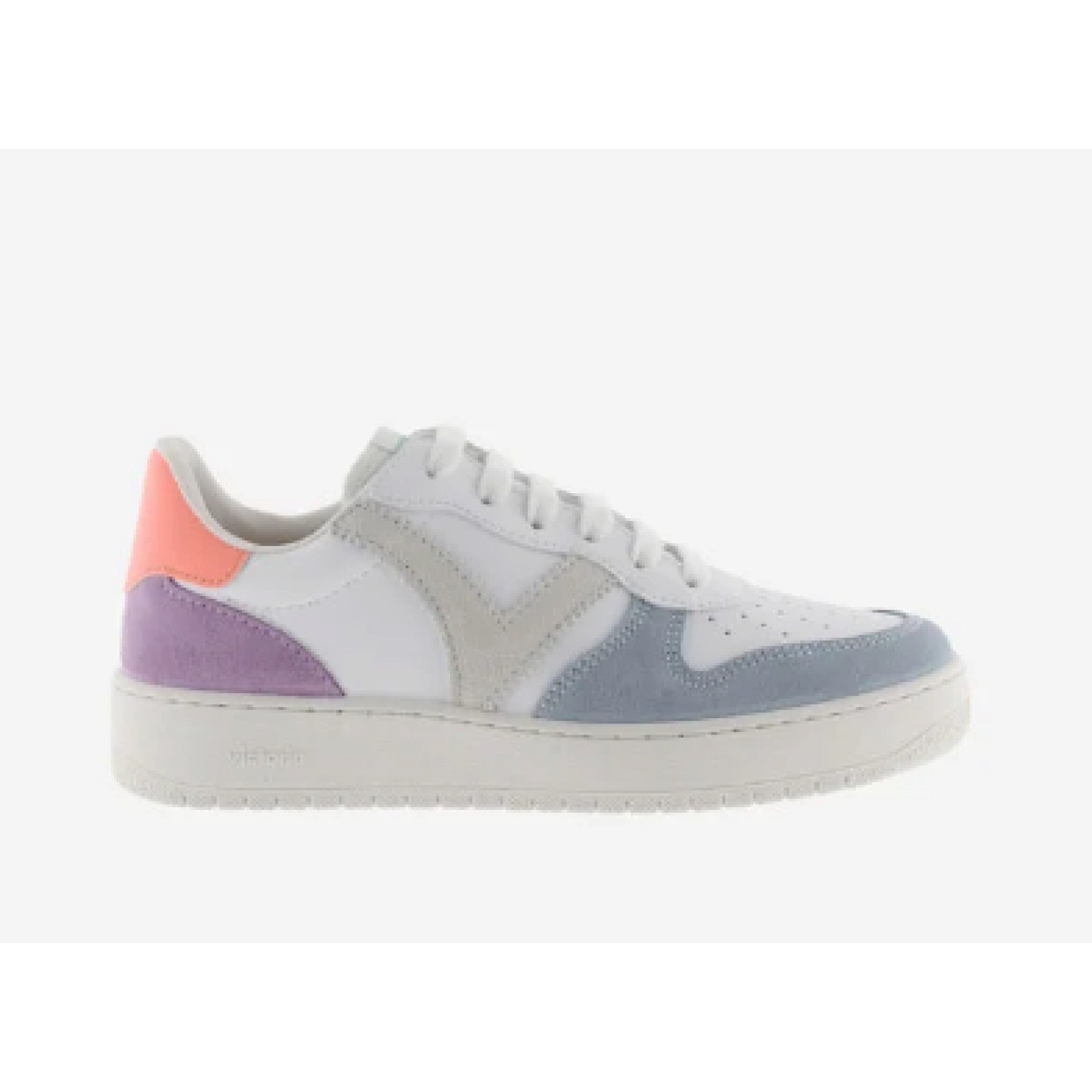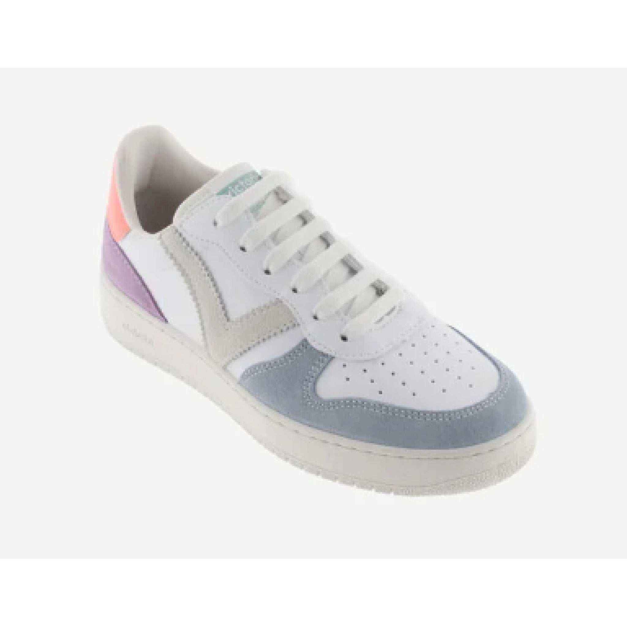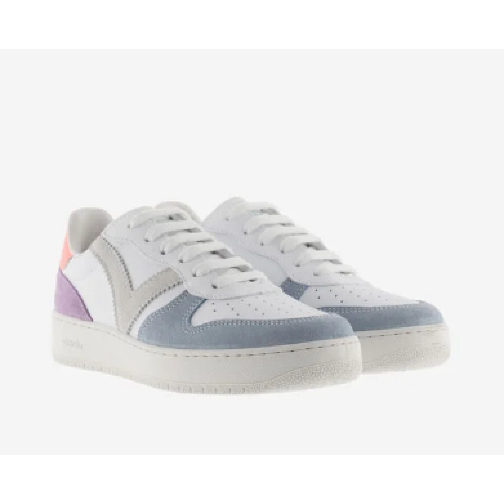 Sneakers bianche da donna, prodotte in spagna con materiale effetto pelle di alta qualità e inserti in crosta di cuoio multicolore. dettagli fluorescenti sul retro e sulla punta dei lacci. suola di 3 cm realizzata con oli vegetali anziché minerali per ridurre l'impatto ambientale.