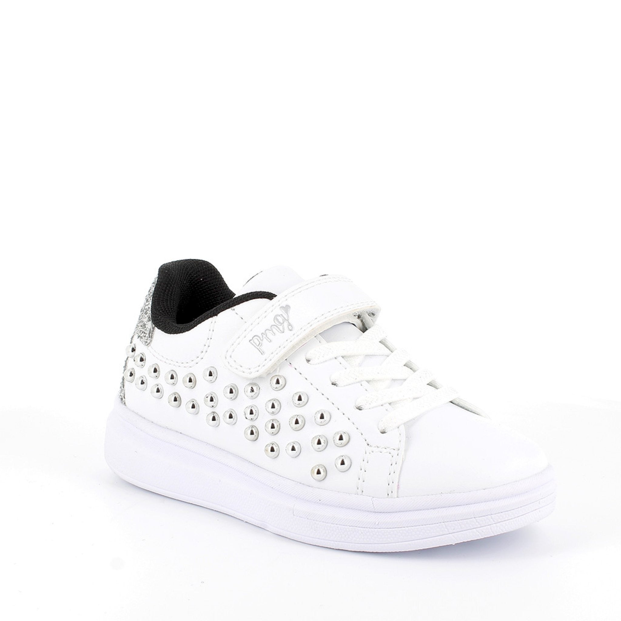 Sneaker bambina con velcro e borchie numerata: 24 - 39 materiale: pelle sintetica fodera: tessuto sottopiede estraibile: si chiusura: velcro + laccio elastico tipologia: sneaker