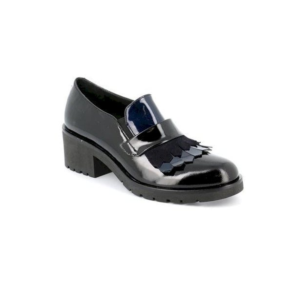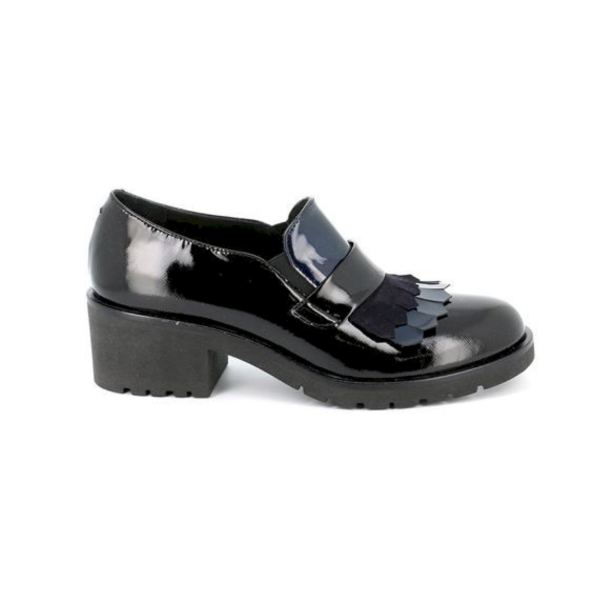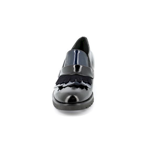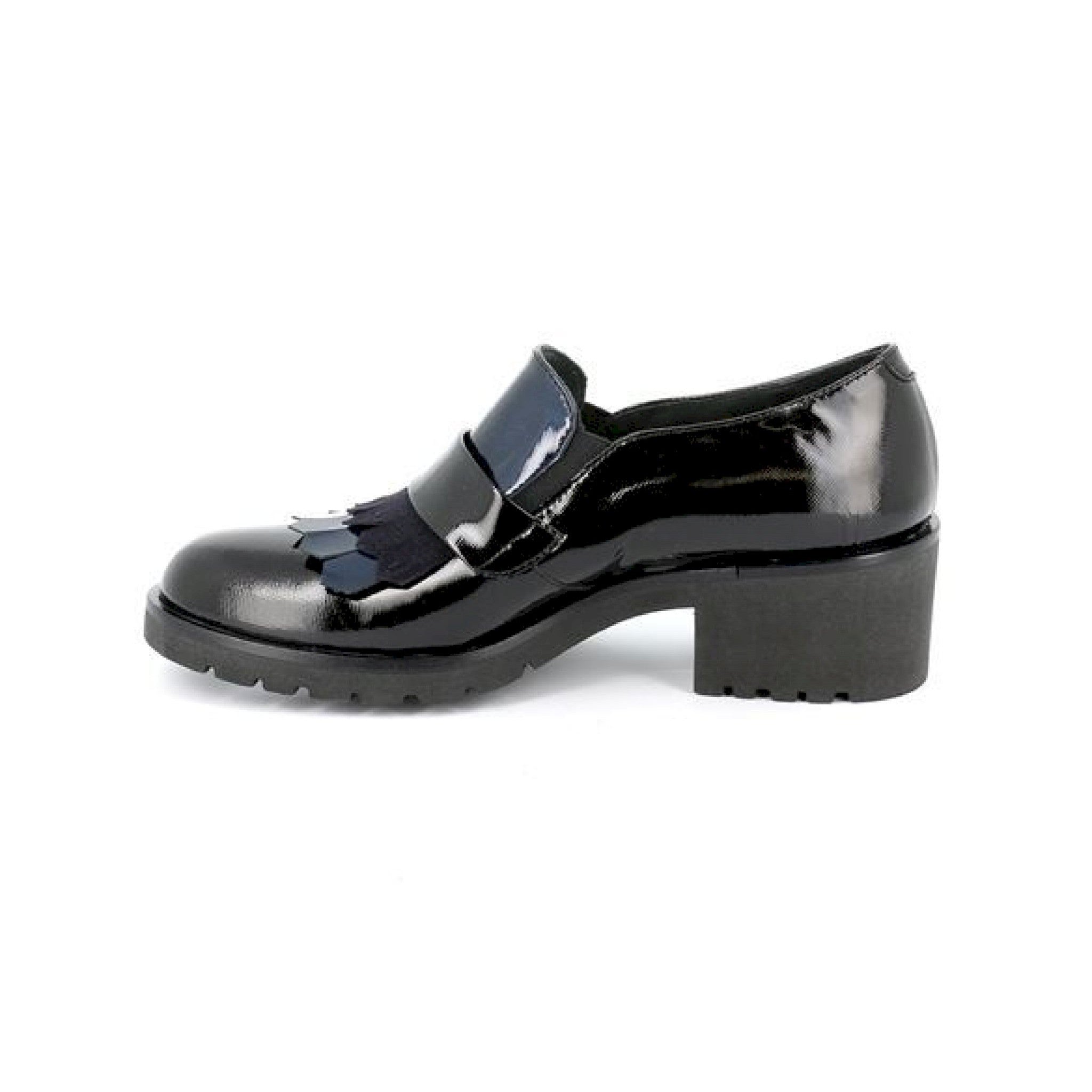 Mocassino elegante e sofisticato, la tomaia verniciata si accosta dolcemente alla frangia,anch'essa in vernice, posta nella linguetta, donandole quel tocco di classe in più. perfetta per le occasioni più formali, se accostata ad outfit particolari può offrire look estrosi ed eccentrici.