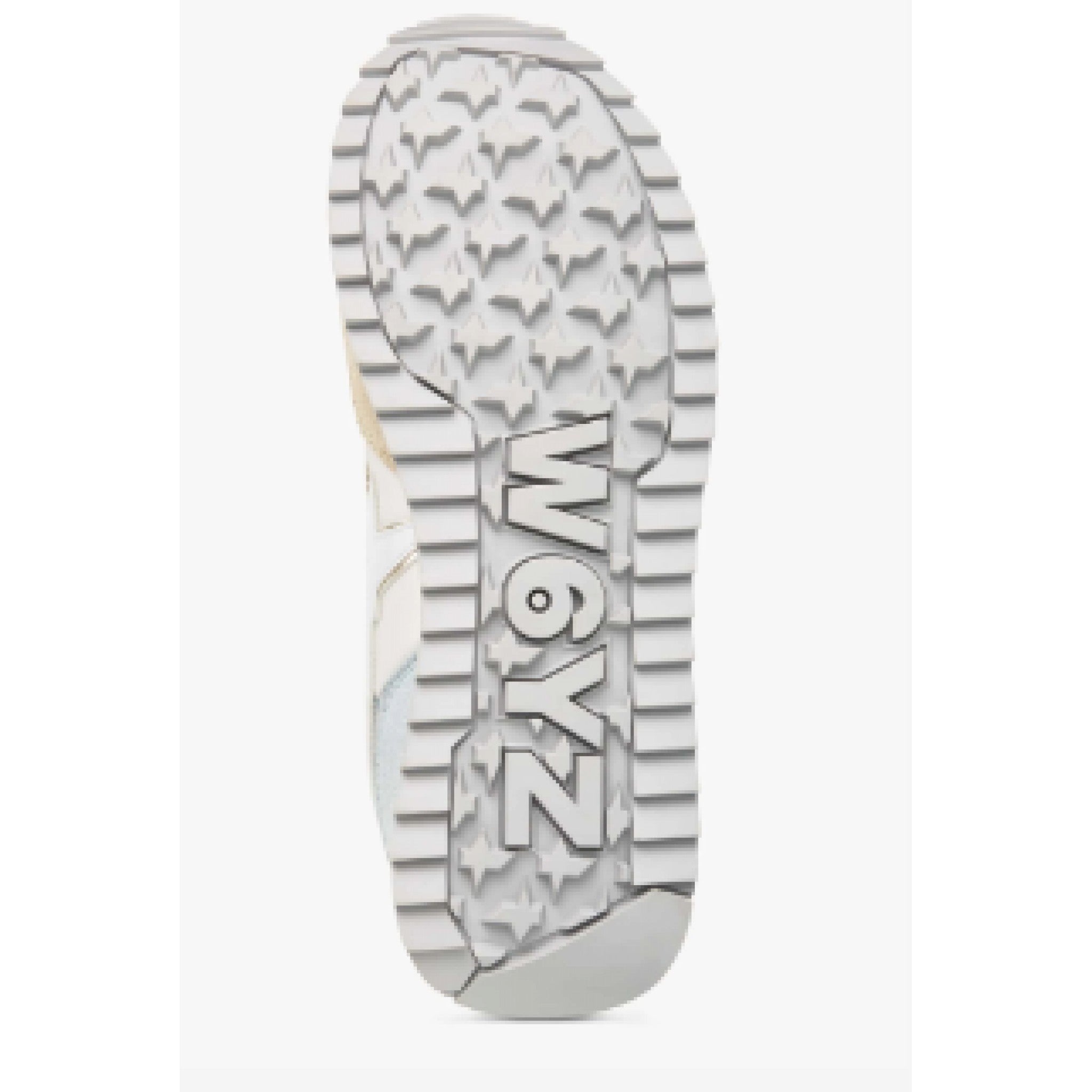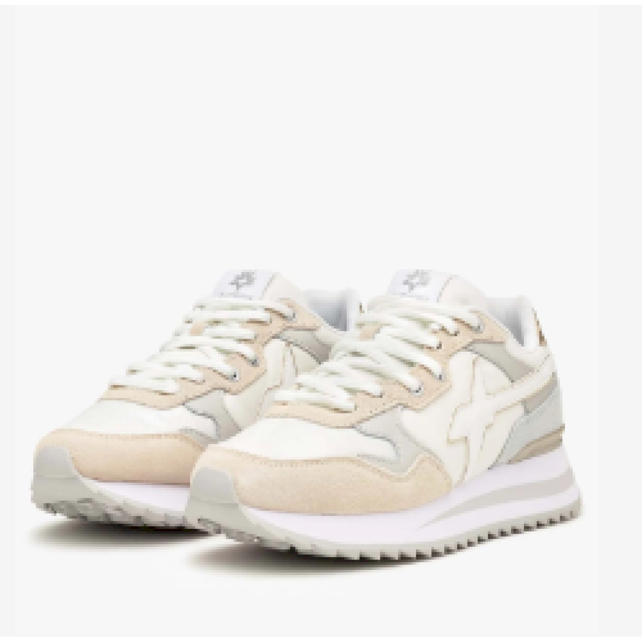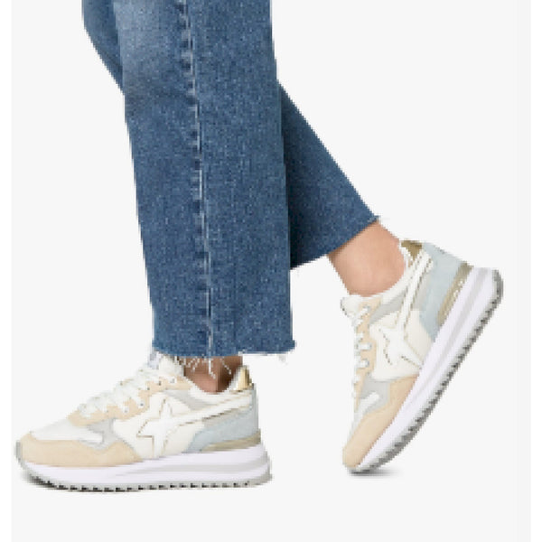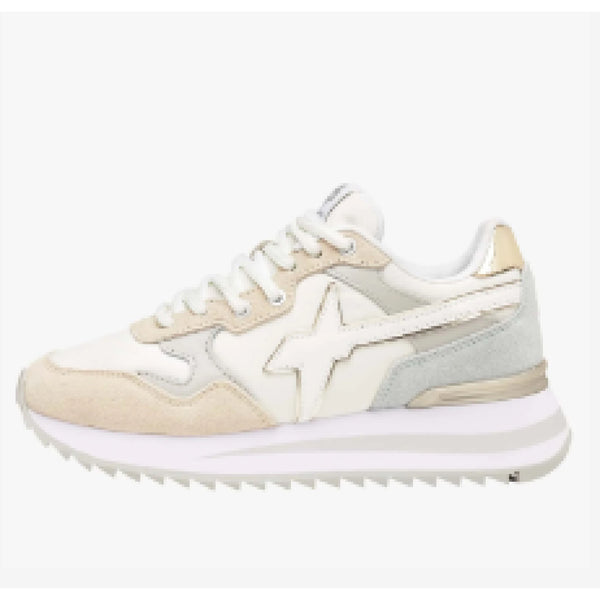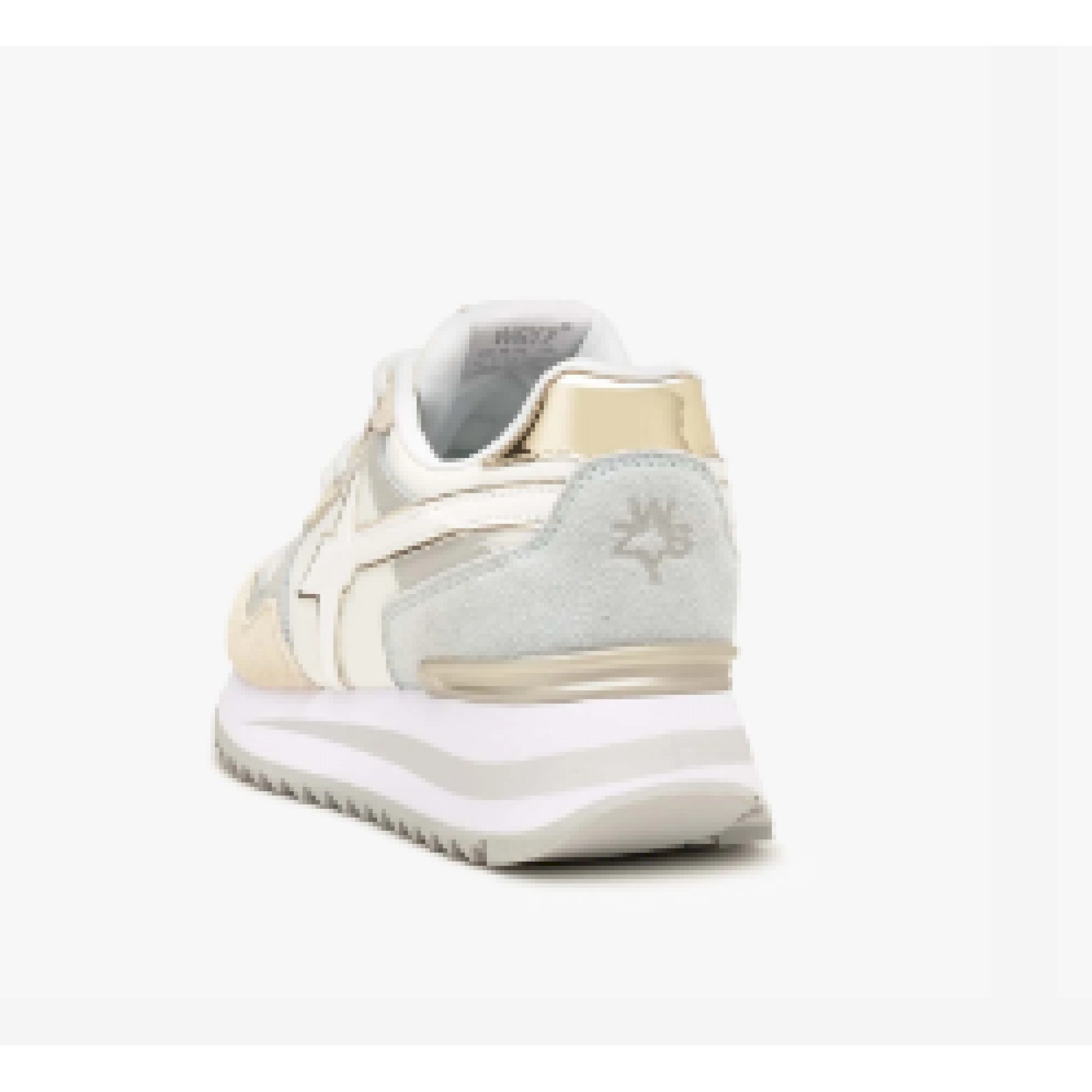 dinamica e cool, la sneaker metropolitana si accende del bagliore dorato della pelle a specchio, nei dettagli laterali e nel topponcino. la tomaia in tessuto tecnico e suede offre linee sportive e grintose, completate da logo laterale e suola in gomma ultraleggera con spoiler in gomma sotto il tallone. fondo effetto plateau, con battistrada personalizzato.